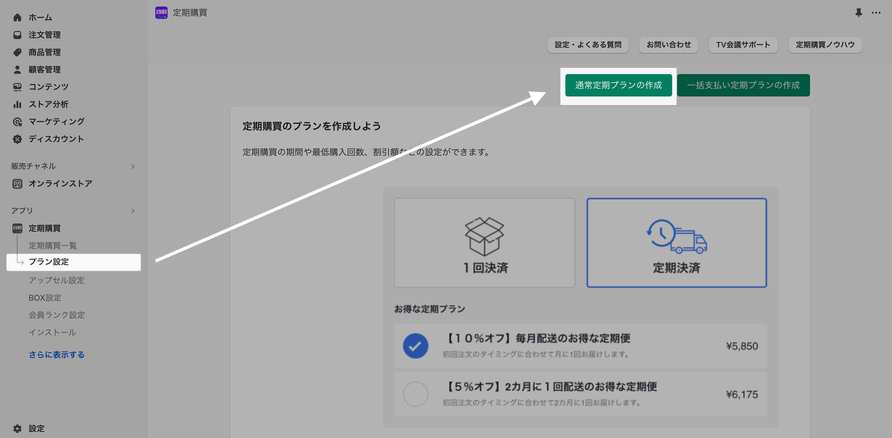 左メニューの「プラン設定」より「通常定期プランの作成」をクリック