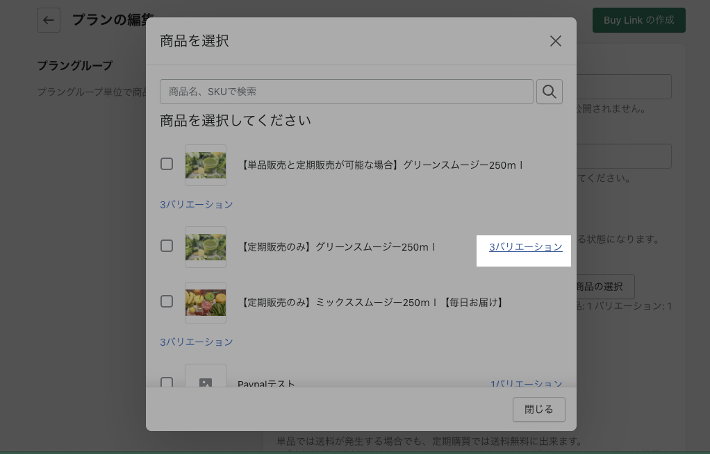 商品名の左側にはチェックを入れず「バリエーション」をクリック