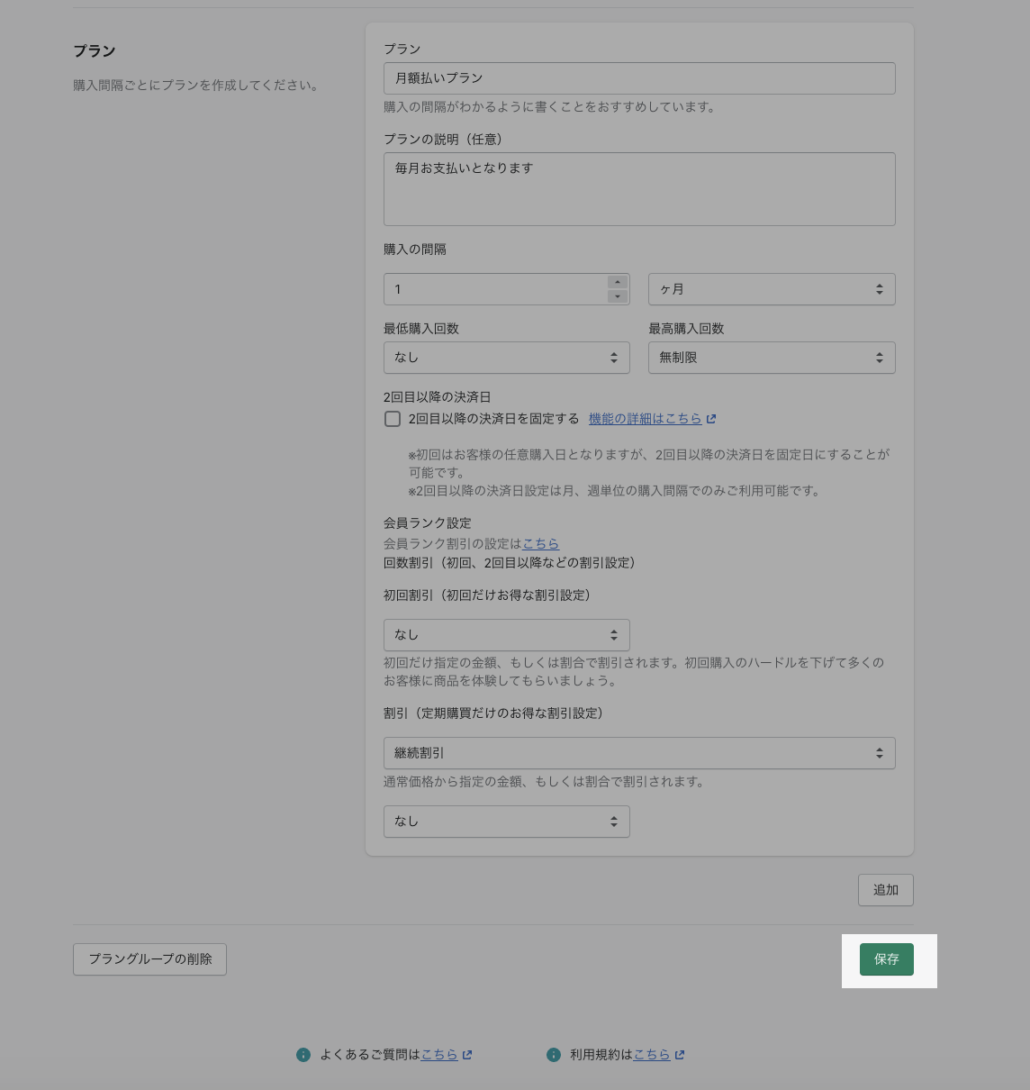 プラン設定画面最下部の「保存」をクリック