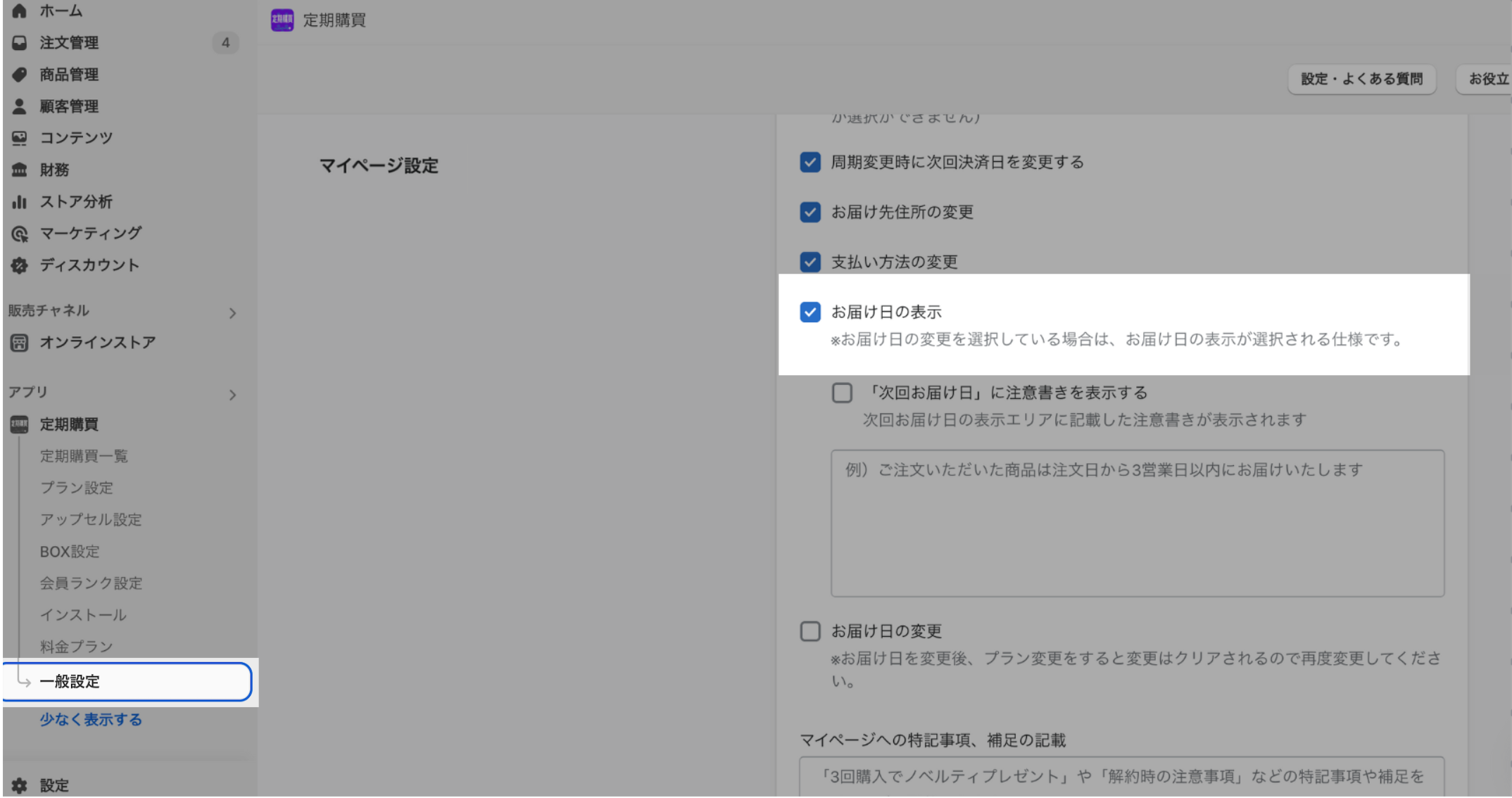 定期購買アプリの一般設定にて「お届け日の表示」にチェックを入れて保存してください。