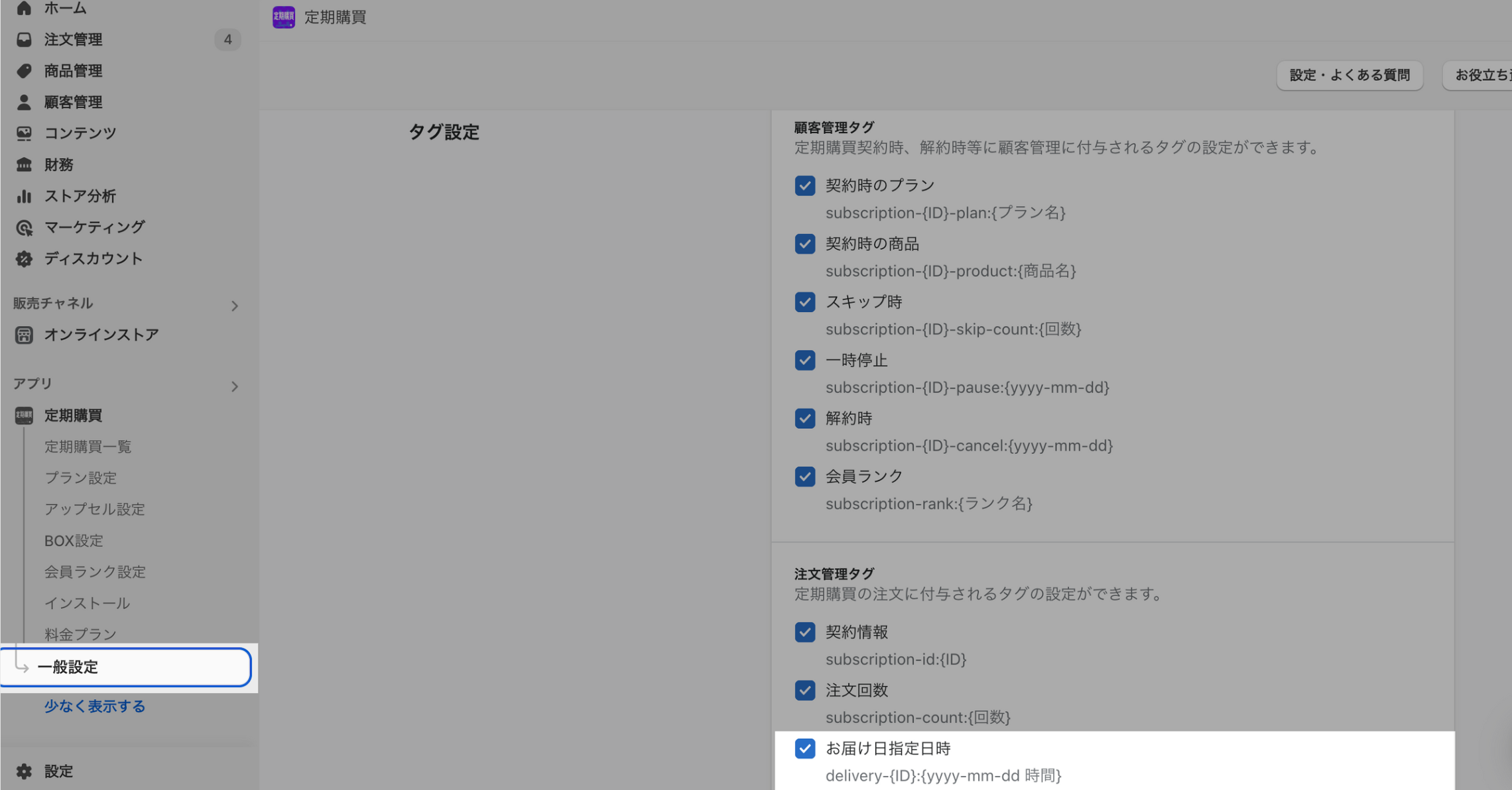 ※ タグを付与するには、 一般設定 > 注文管理タグ >「お届け日指定日時」 を ON にしてください。