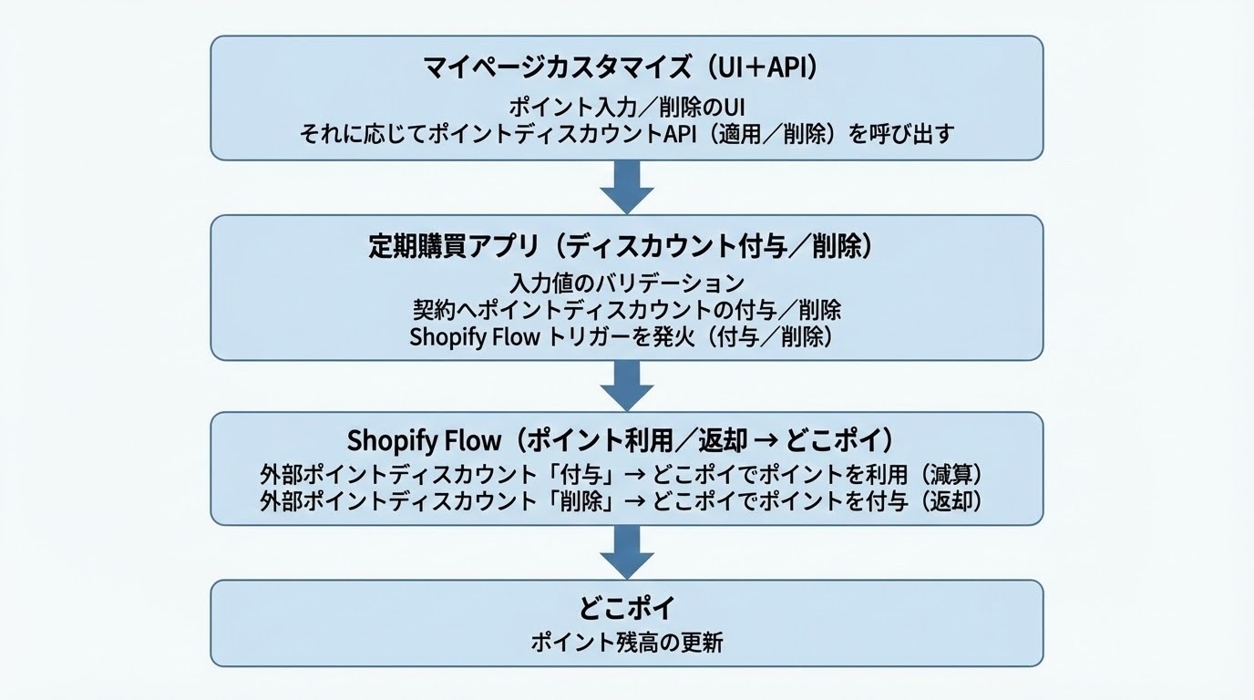 2回目以降のポイント利用 | ×(不可) | ◎(マイページAPI+Flowで、マイページからのみ可能。管理画面からの利用は不可) |