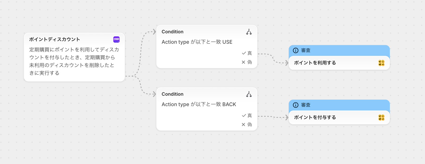 ポイント返却(割引削除時) | – | ◎(Flowで実行) |