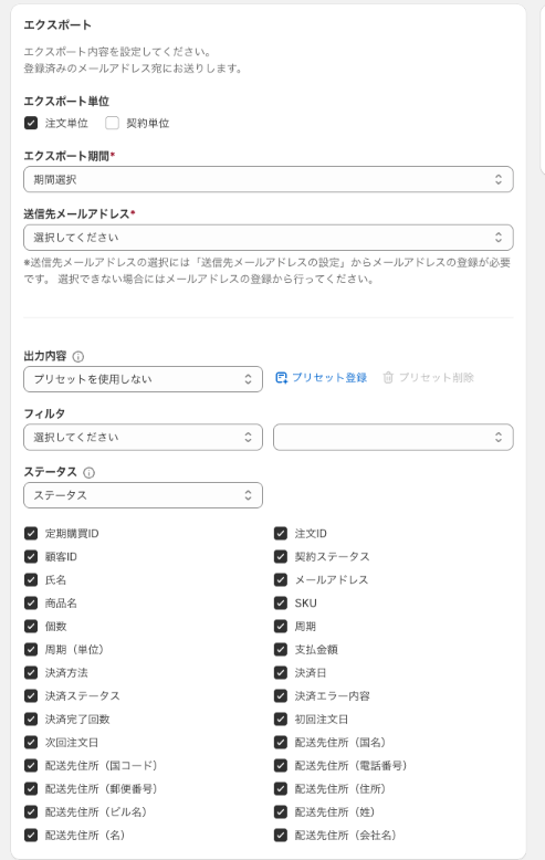 定期購買契約に含まれる情報のみで出力されるため、単品商品の情報はエクスポートファイルに含まれない。