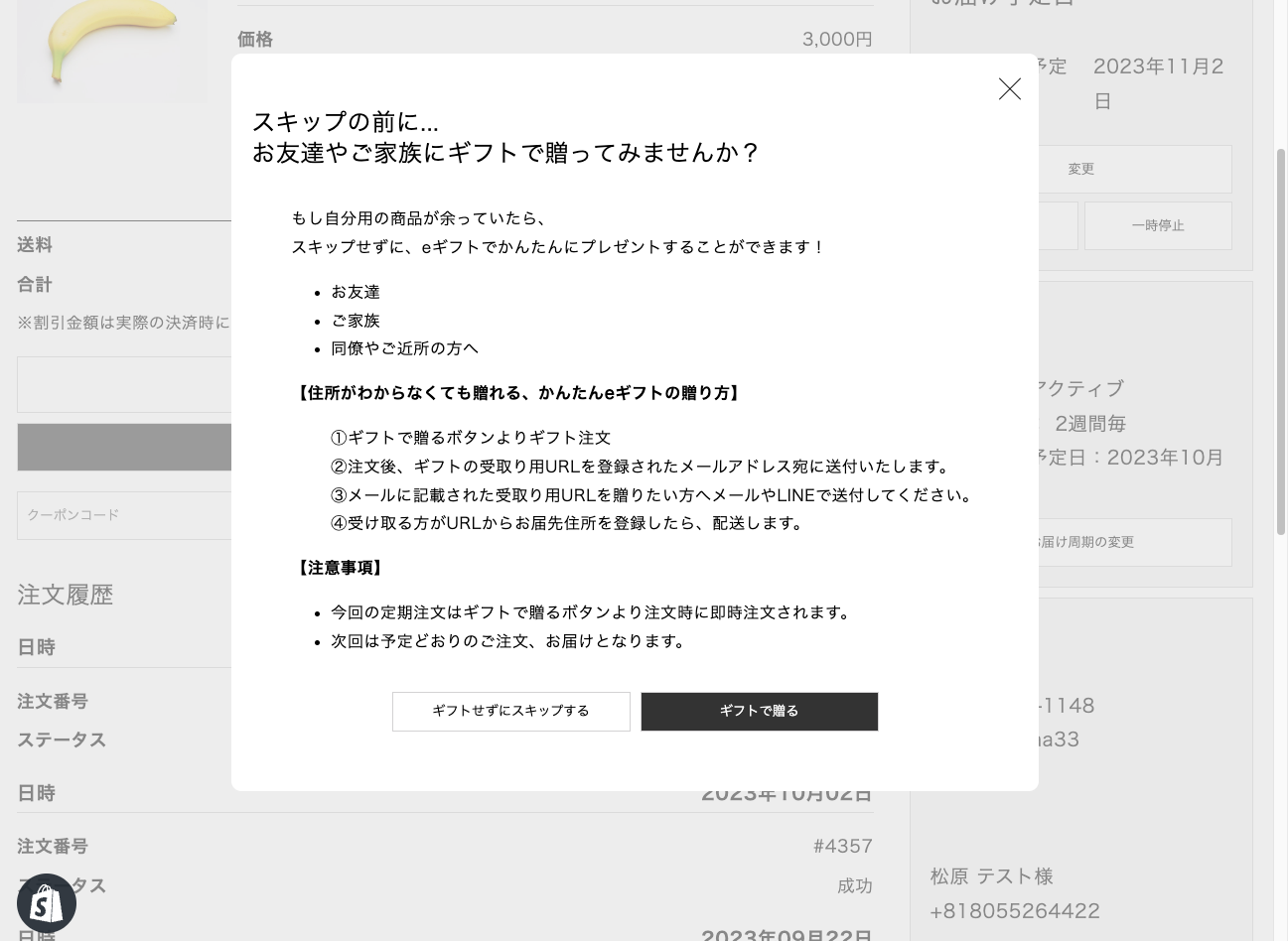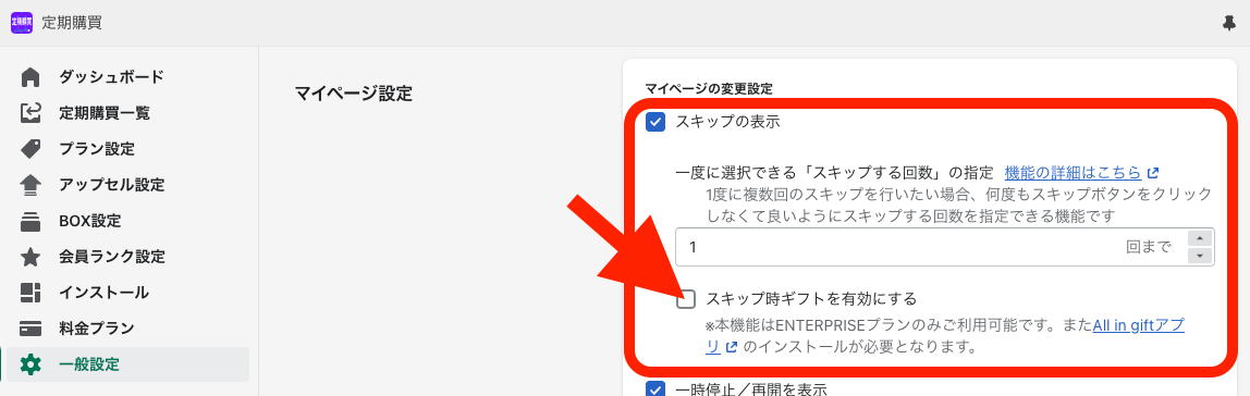 定期購買アプリの「スキップ時のegift機能」のみをご利用する場合の設定方法は以下になります。