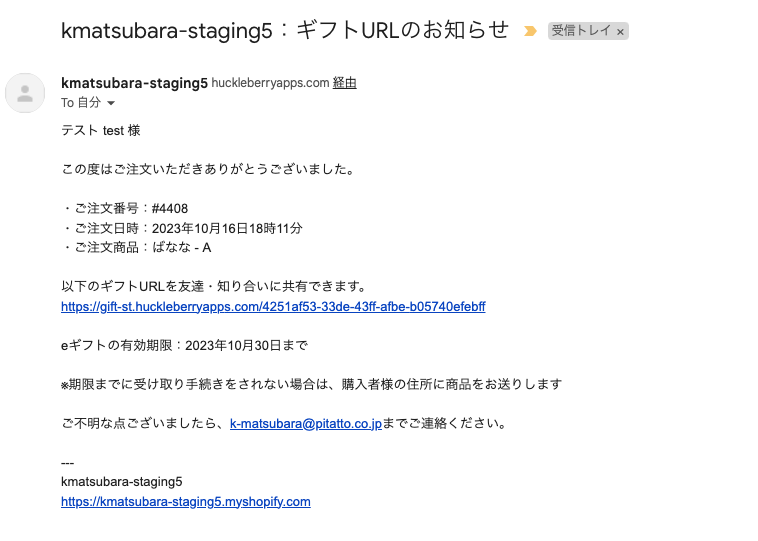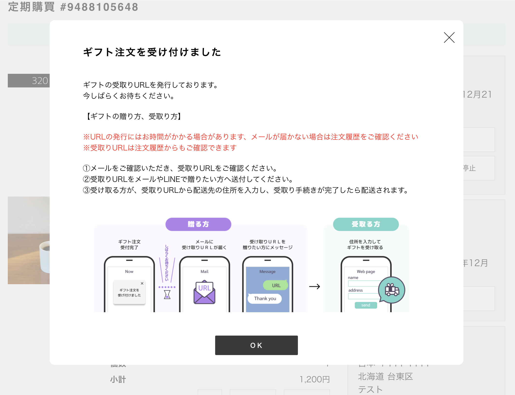 顧客に対してギフト用のURLなどが記載されたメールが送信され、一定時間後(スケジューラー)、マイページにもギフト用URLなどの表記が追加されるため、こちらのURLを贈りたい相手に送信してください。