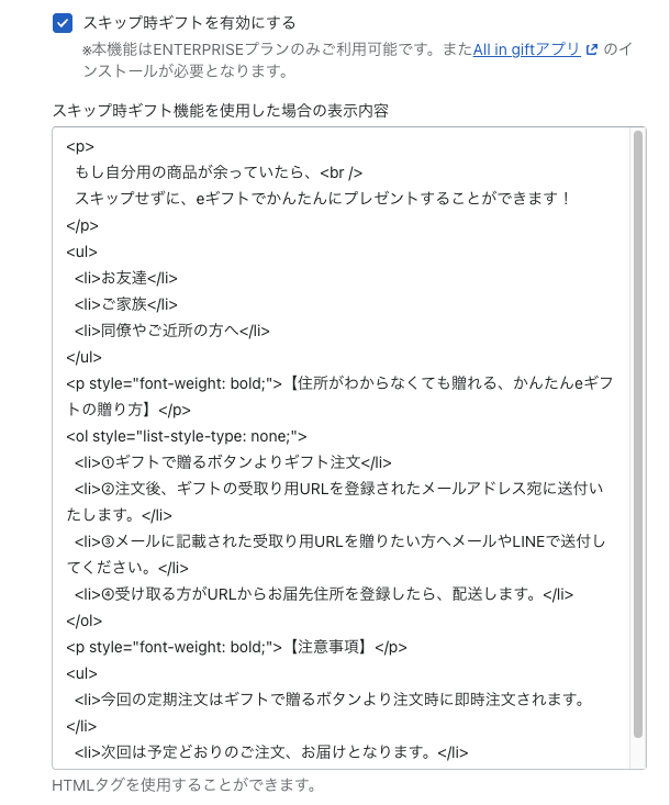 「スキップ時ギフト機能を使用した場合の表示内容」を記入する。