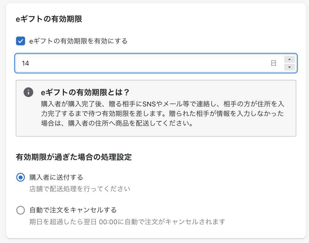 購入した日を起点として、eギフトの受取者が住所入力を行わなかった場合、どのような処理とするのか店舗様にて設定できます。