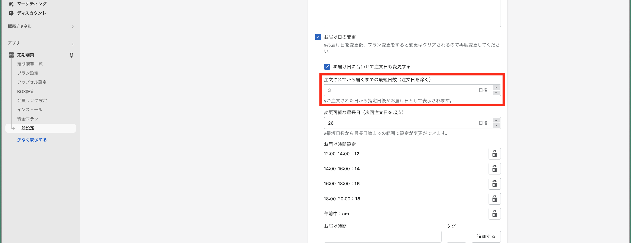 定期購買アプリの配送日時タグは、注文日に「注文されてから届くまでの最短日数(注文日を除く)」に設定された日数を足したもの(⚠️を参照)が反映されるためです。