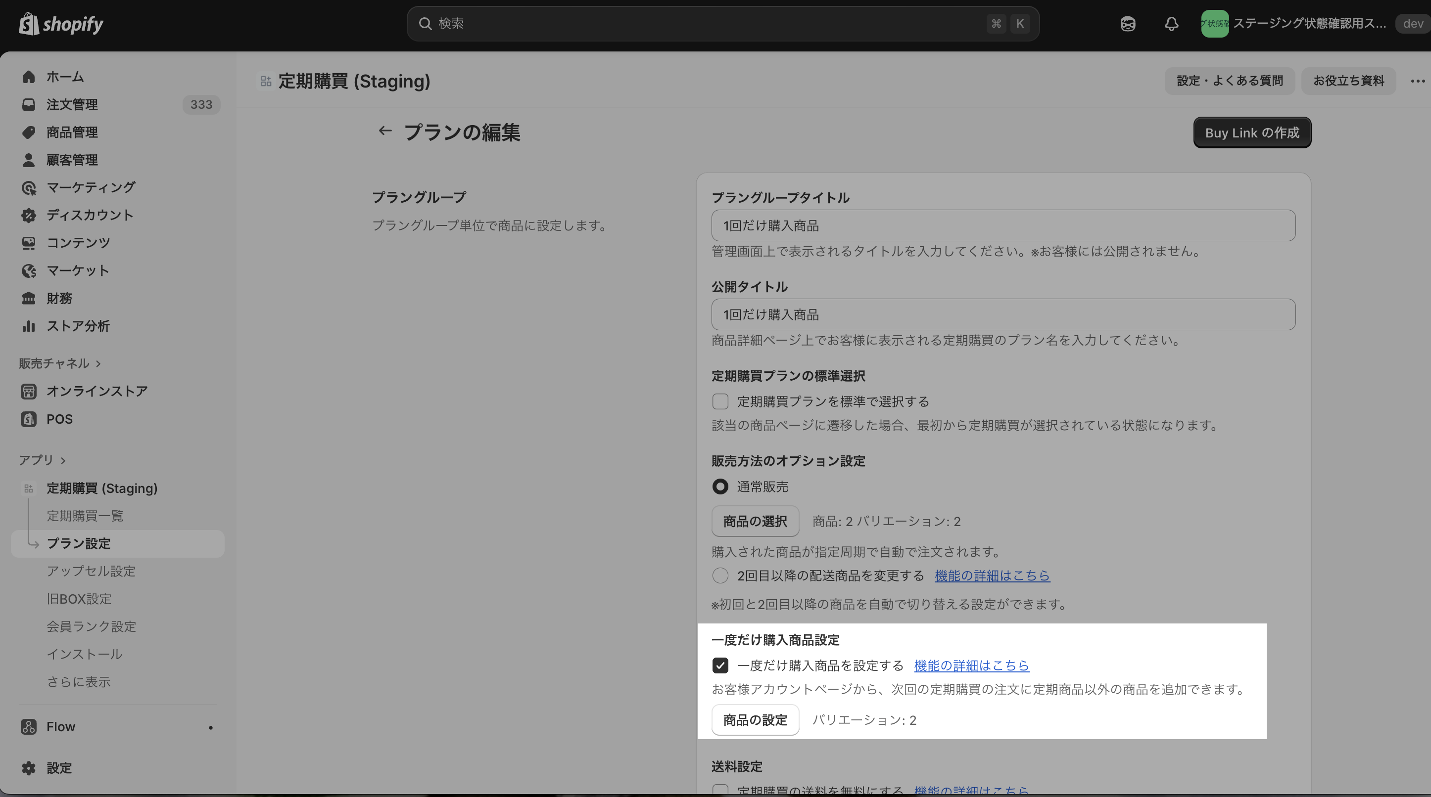プラン設定>プラングループ設定>一度だけ購入商品設定に登録ください