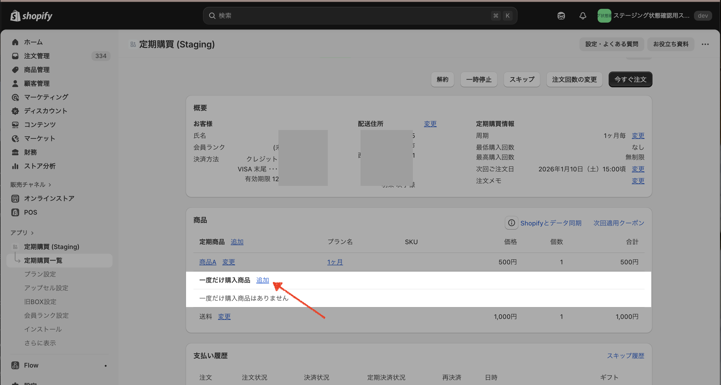 一度だけ購入商品を追加すると、契約詳細画面に 「一度だけ購入」ラベル が表示されます。