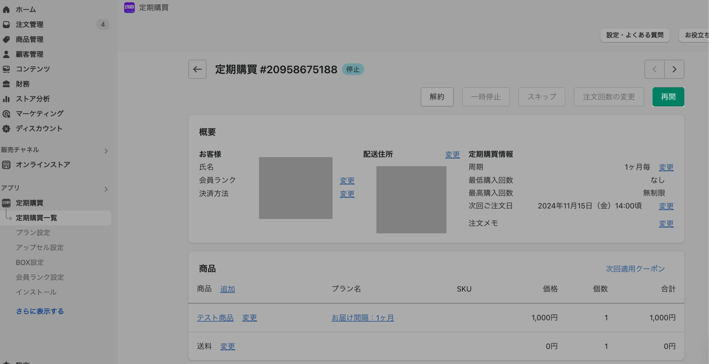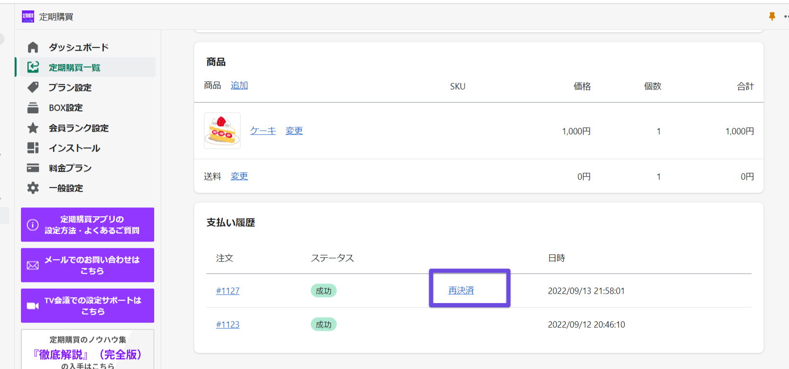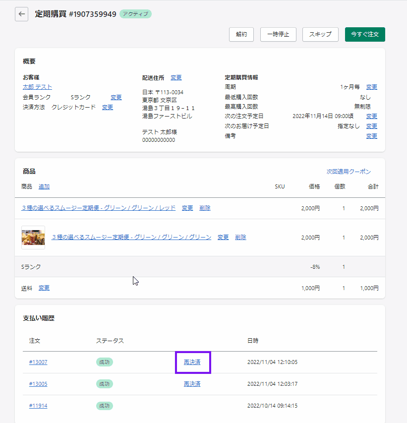 定期購買一覧 > 契約詳細画面にて「再決済」を押下。 定期購買アプリからShopifyに決済リクエストが送られ、決済が成功するとShopifyの注文管理上に注文が作成されます。