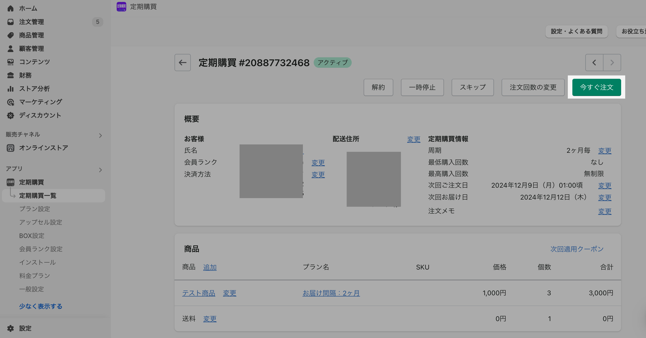 定期購買一覧 > 契約詳細画面にて「今すぐ注文」を押下。 定期購買アプリからShopifyに決済リクエストが送られ、決済が成功するとShopifyの注文管理上に注文が作成されます。