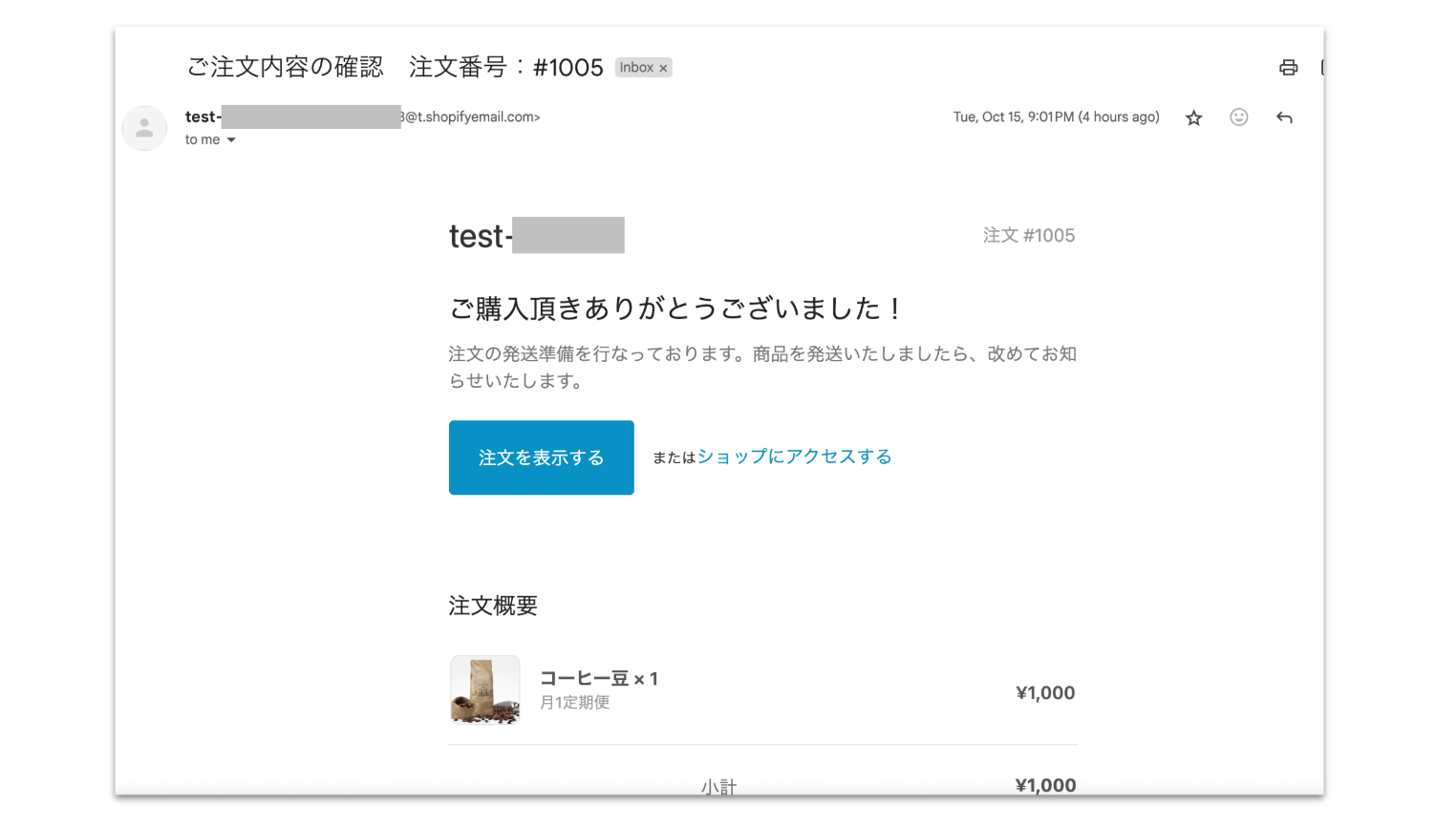 注文作成後、下記の通知メールがShopifyから送付されます。