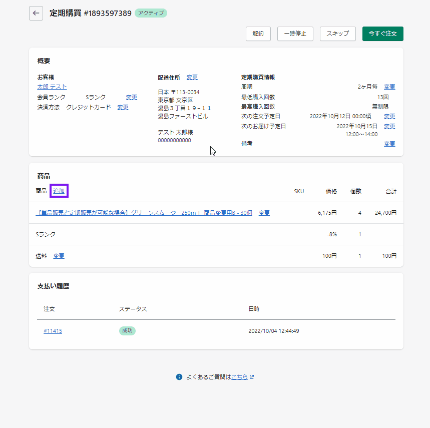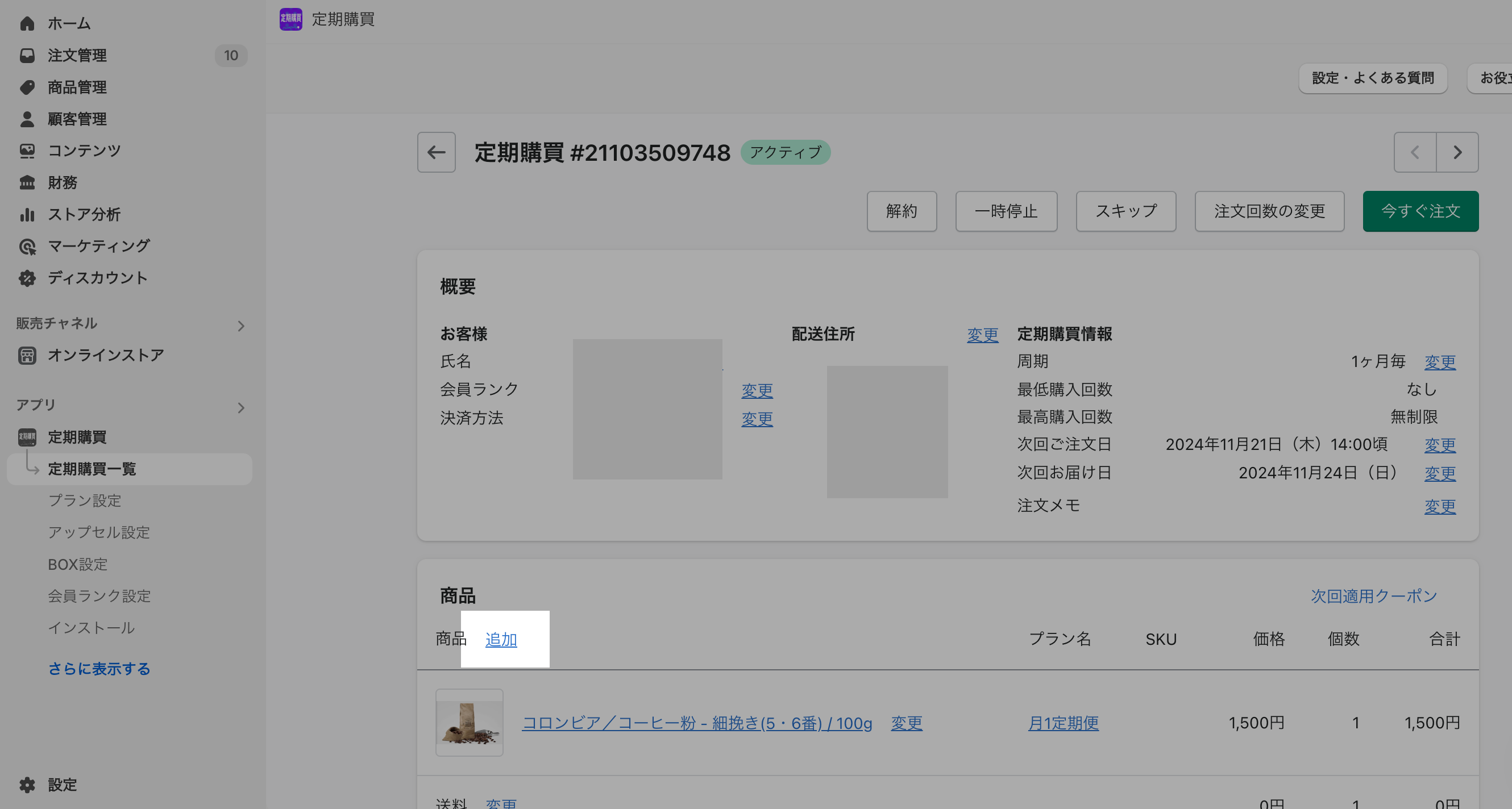 特別な設定は必要ありません。 ストアの管理画面の場合、定期契約上にデフォルトで「商品追加」ボタンが表示されます。