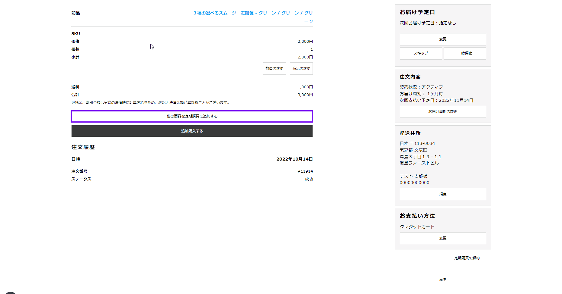 定期購買アプリ管理画面「定期購買一覧」より該当の契約を開き、画面中央「他の商品を定期購買に追加する」を押下することで商品の選択画面に遷移し、商品、バリエーション、数量を選択できます。
