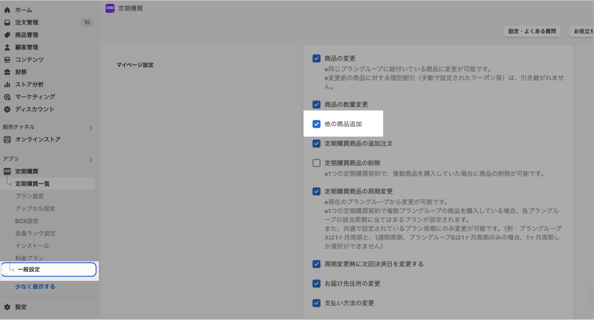 定期購買アプリ管理画面「一般設定」>マイページの変更設定「他の商品追加」にチェックを入れて下さい。