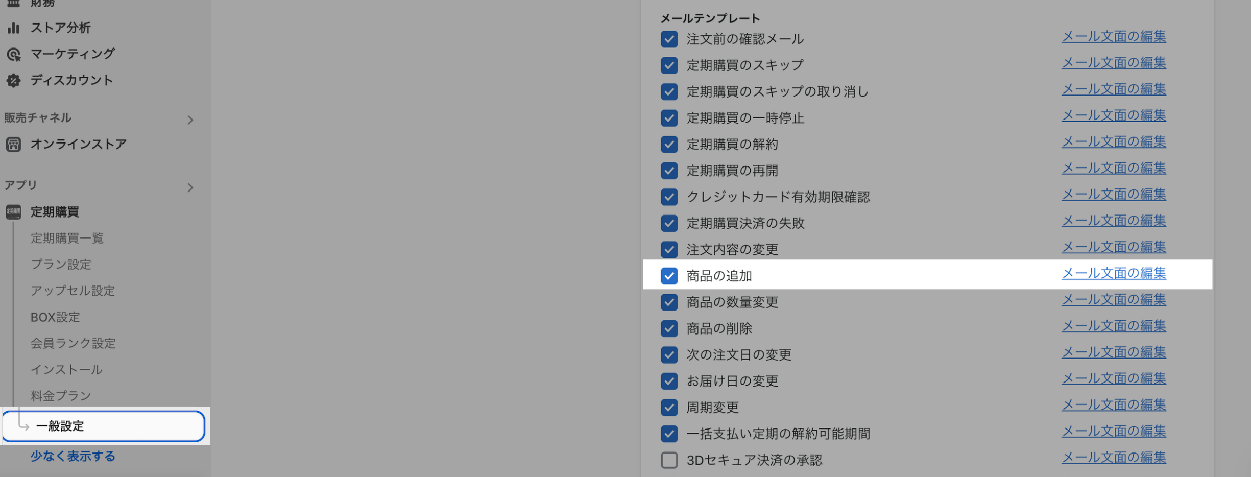 顧客宛に通知を送付したく無い場合は、「一般設定」>「メール設定」>「メールテンプレート」にて「商品の追加」をOFFにしてください。