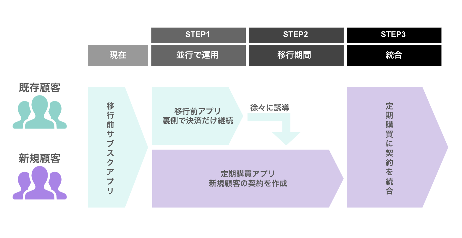 現在、ご利用中のサブスクアプリはそのままご利用を続けます。オンラインストアの商品ページなどの購入導線については、ご利用中のアプリから「定期購買」アプリに切り替えを行なってください。