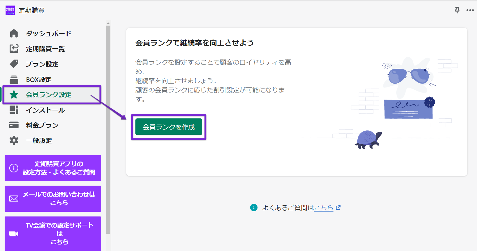 定期購買アプリの「会員ランク設定」の「会員ランクを作成」をクリックしてください。