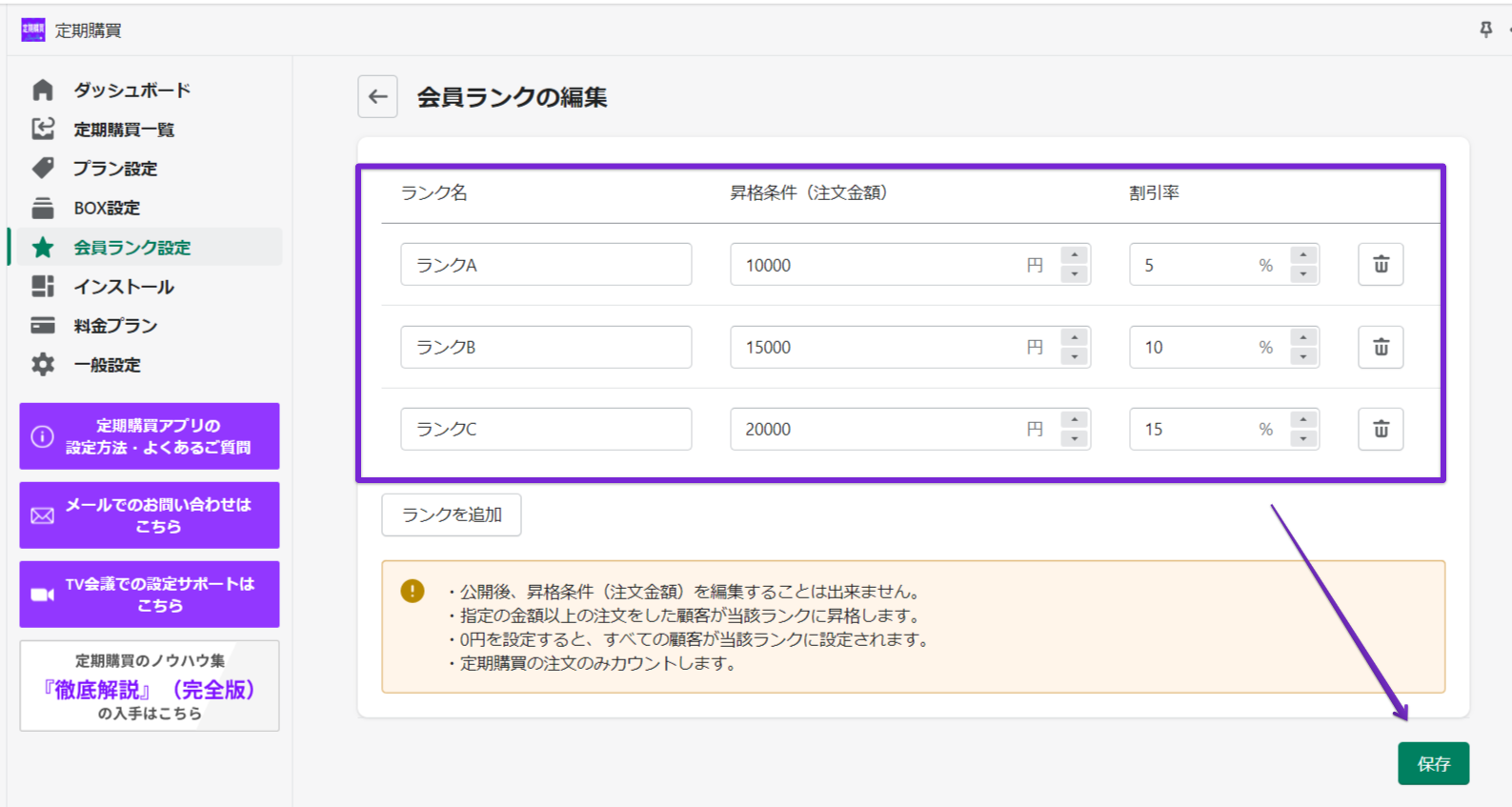 会員ランクの編集画面で、ランク名・昇格条件・割引率を入力し、保存ボタンをクリックします。