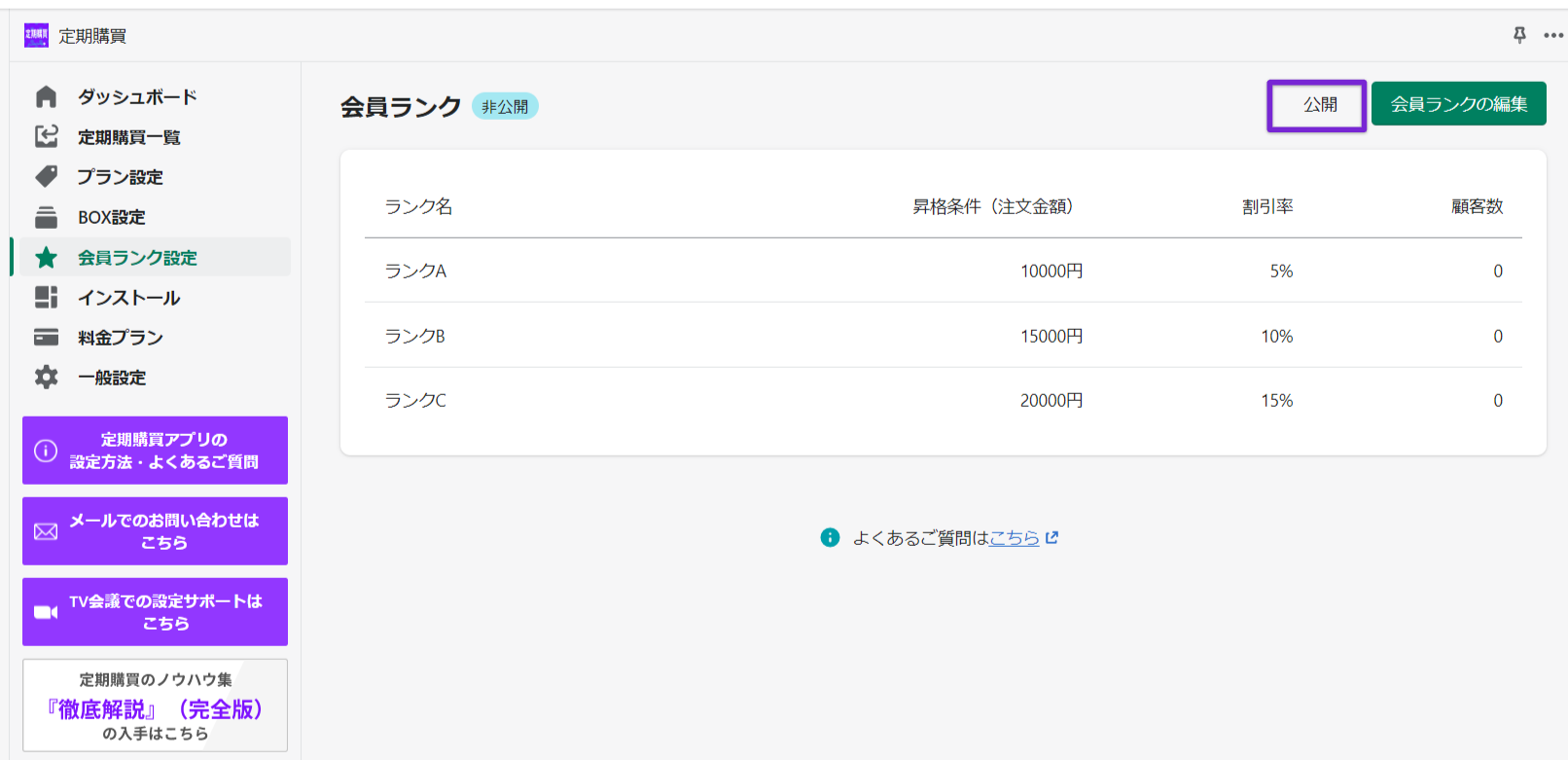 会員ランクの昇格条件を0円で設定すると、定期契約中のすべての顧客に該当の会員ランクが適用されます。