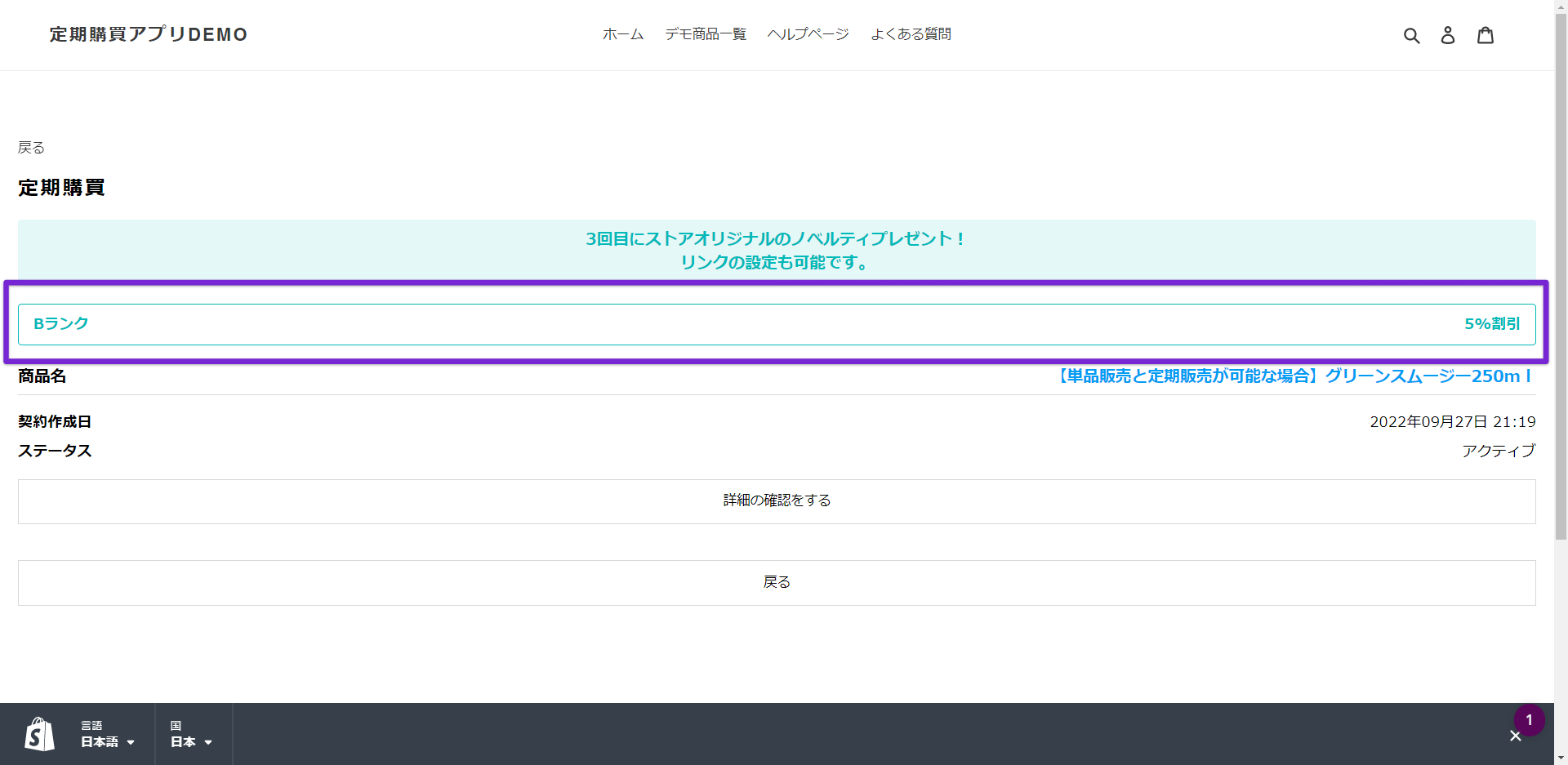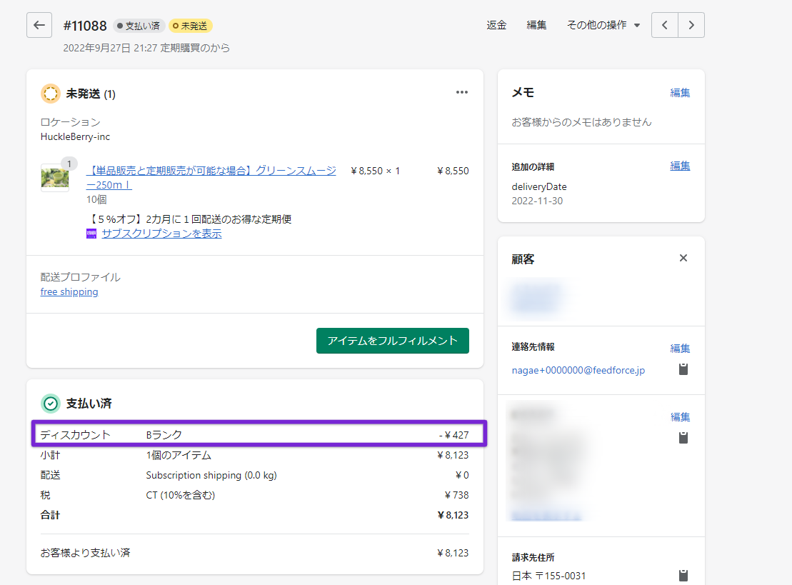 会員ランクが適用されると、該当の顧客にて作成される全ての定期注文に対して、会員ランクの割引が適用されるようになります。