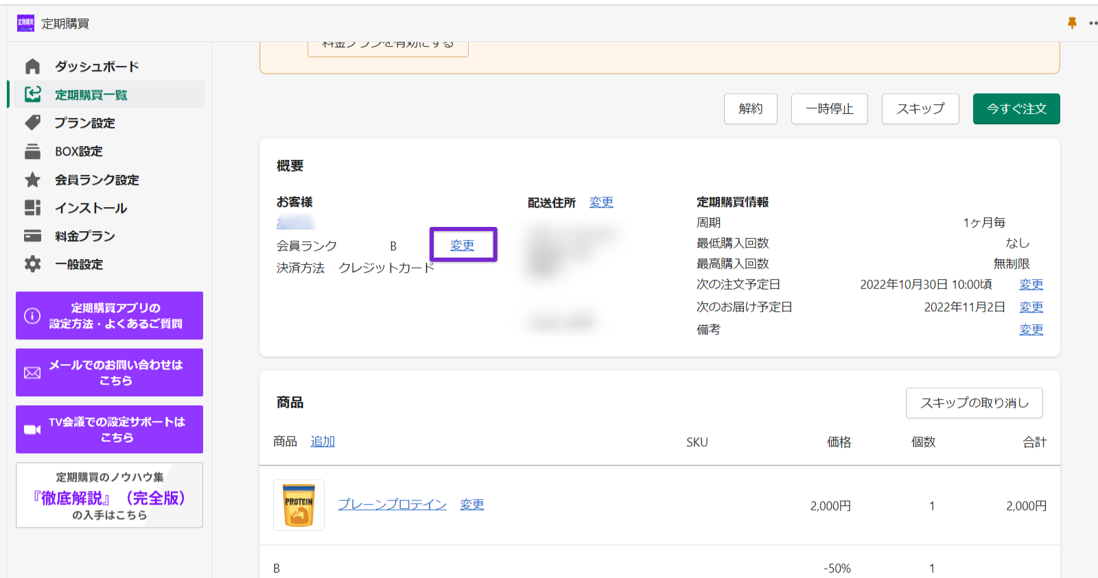 「定期購買一覧」から各定期契約を開き、会員ランクの横にある「変更」ボタンをクリックします