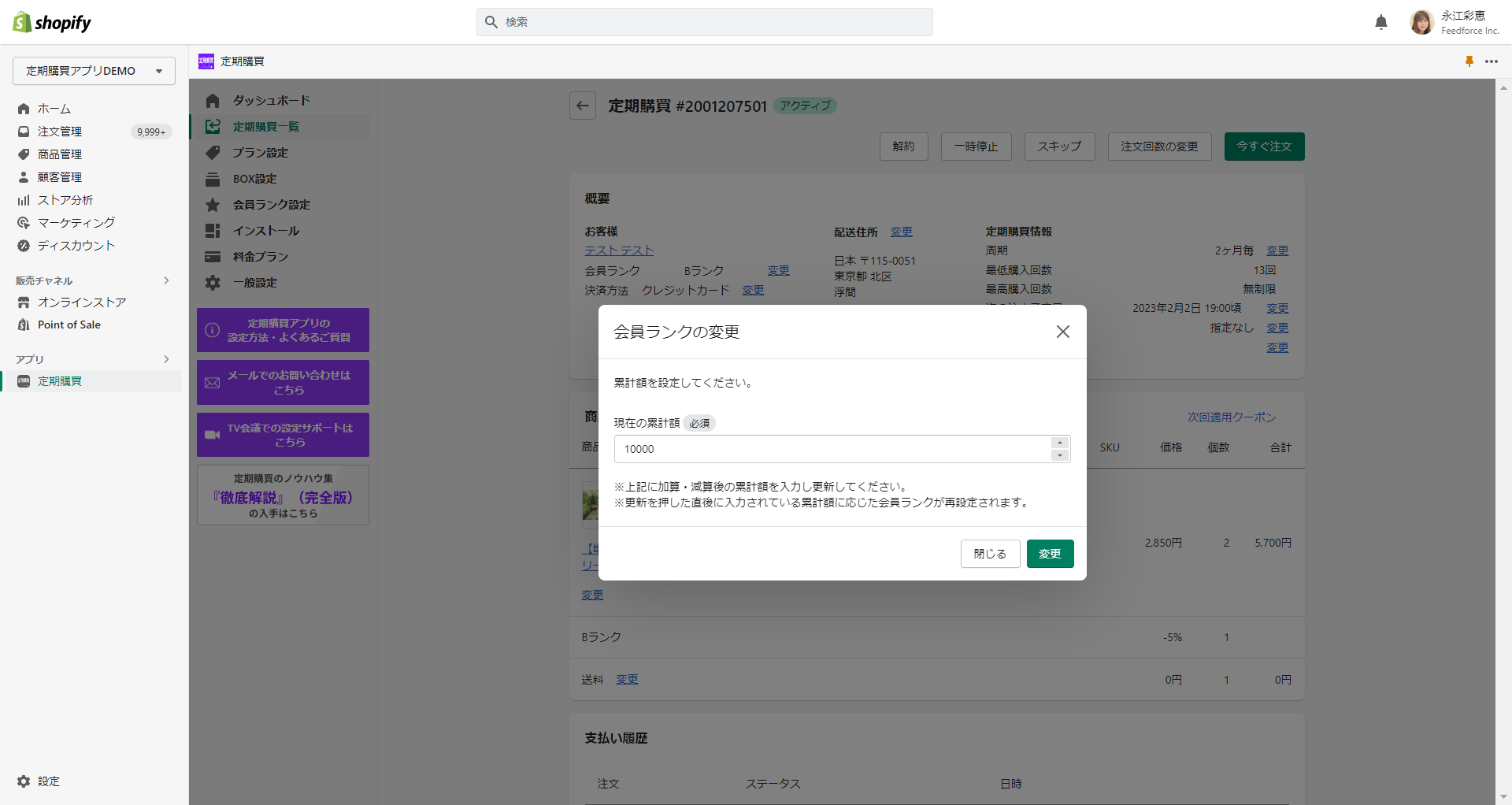該当顧客に適用したい累計の定期注文金額を入力し、「変更」ボタンをクリックすると、入力した金額に応じた会員ランクが自動的に付与されます。