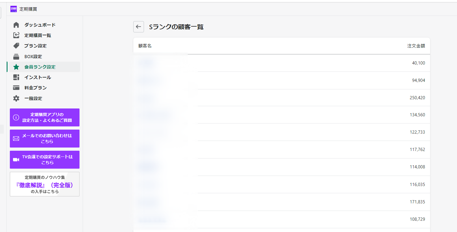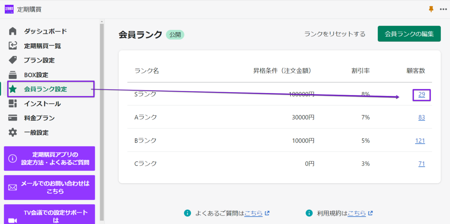 会員ランク設定から、会員ランクが適用されている顧客数、顧客名、顧客ごとの累計定期注文金額を確認することができます。