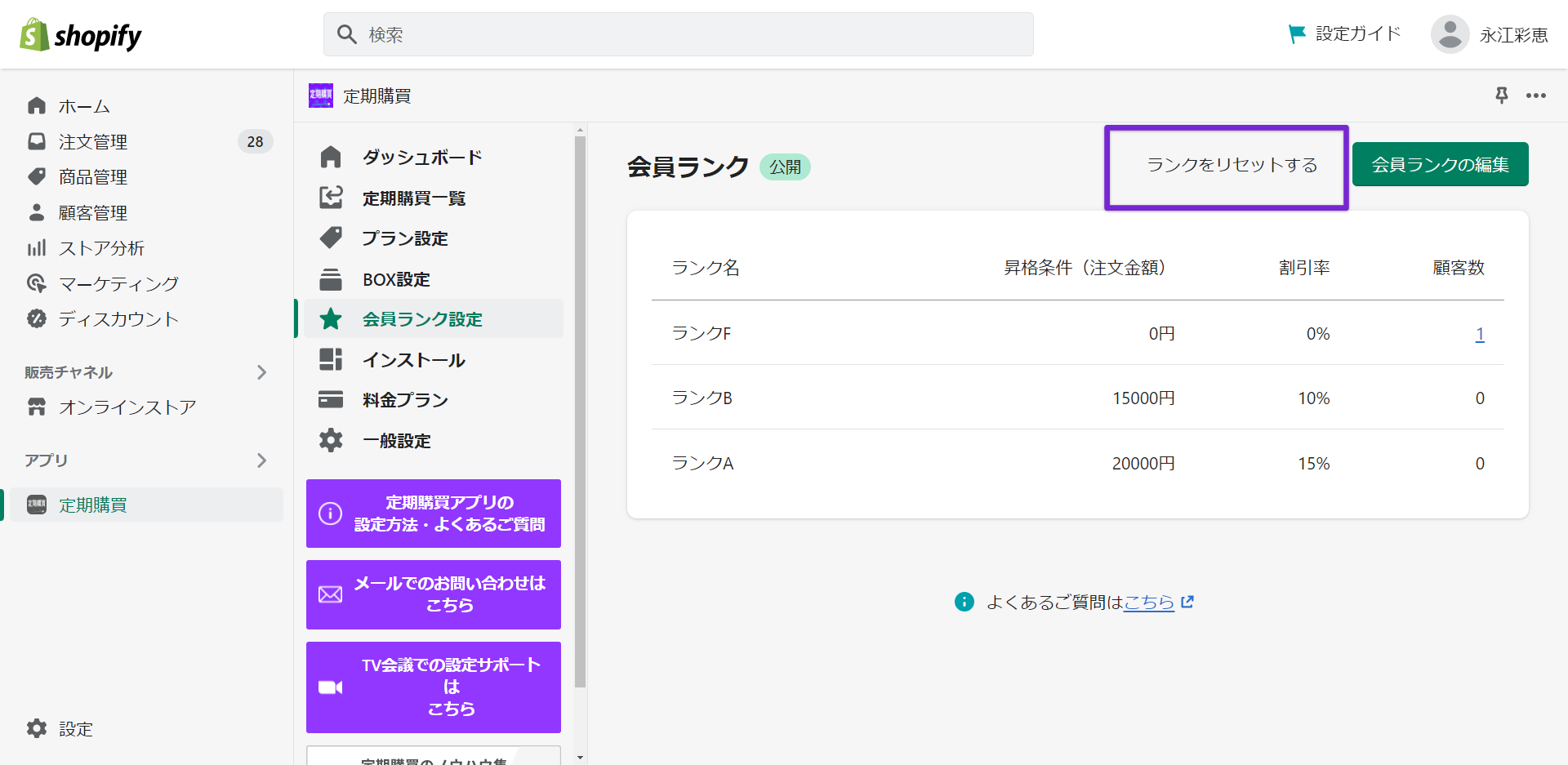ランクをリセットすると、全顧客から会員ランクや、会員ランクに関するタグが削除され、ランクごとの割引も適用されなくなります。