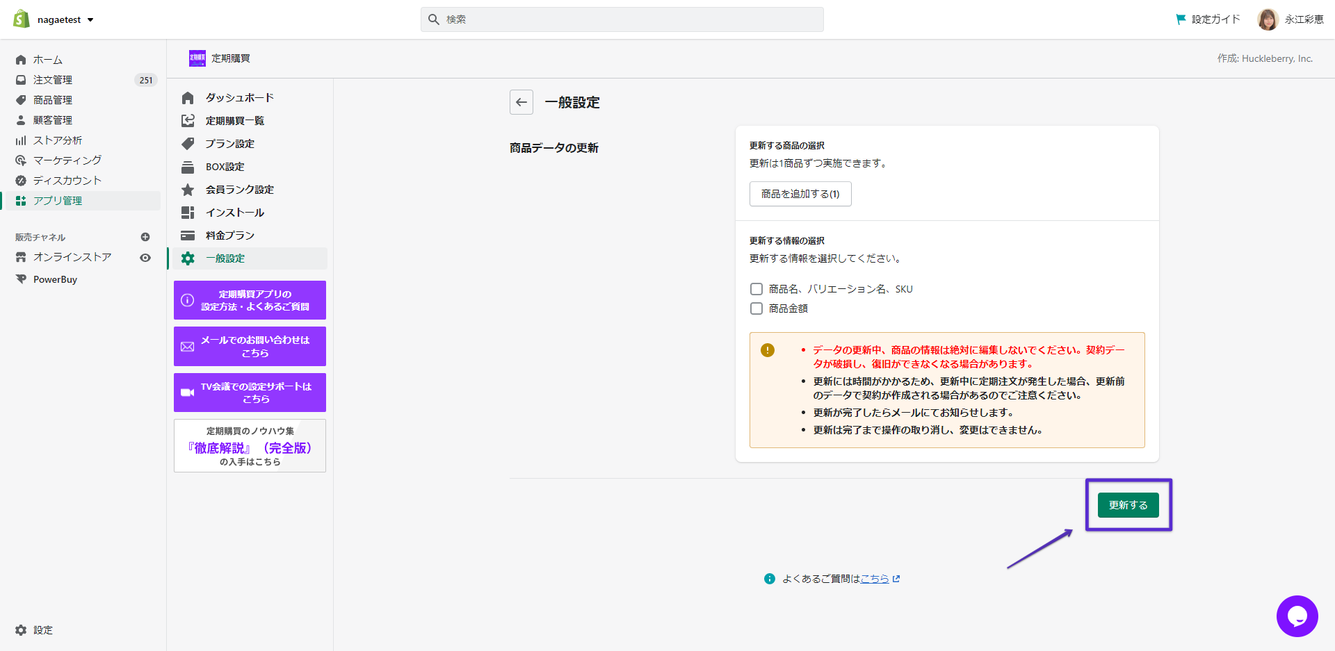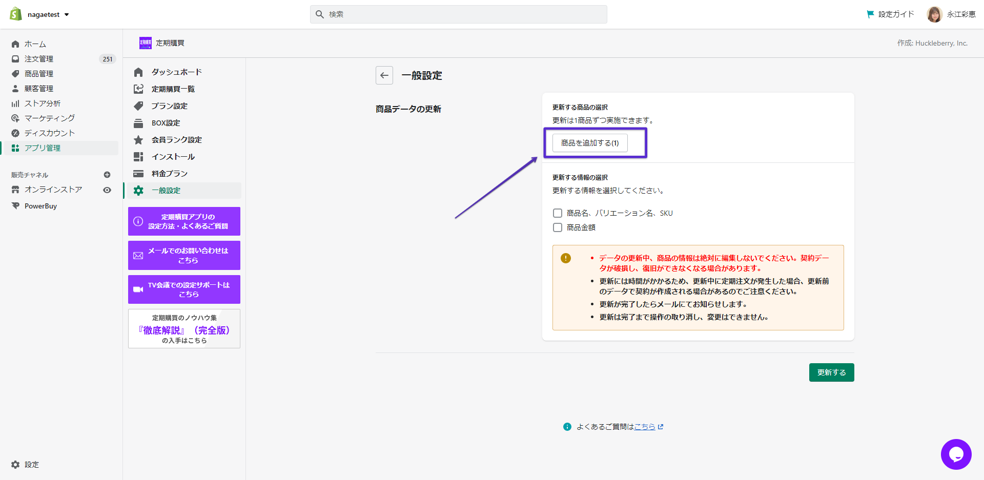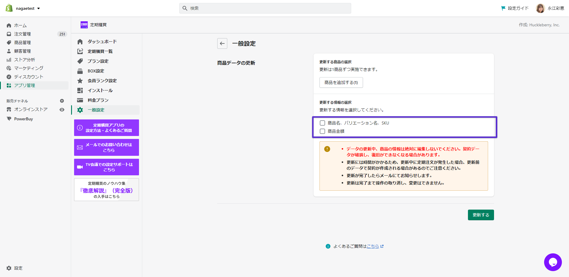 機能を使用する前にShopifyの商品管理にて、定期商品の下記項目が最新の情報が反映されていることを必ず確認してください。