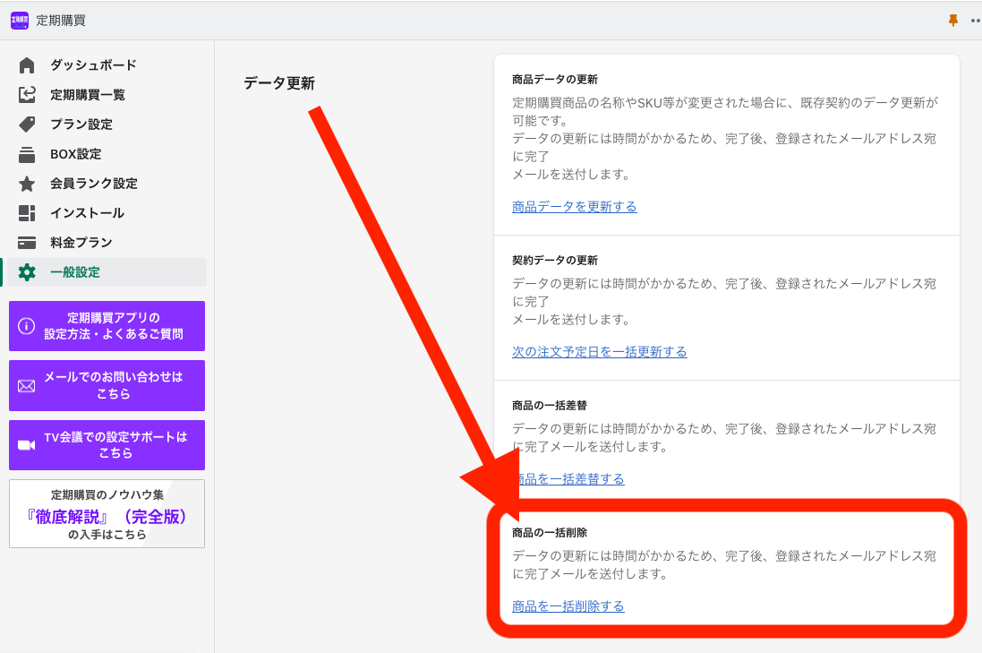 「一般設定」>「データ更新」>「商品を一括削除する」をクリックする。