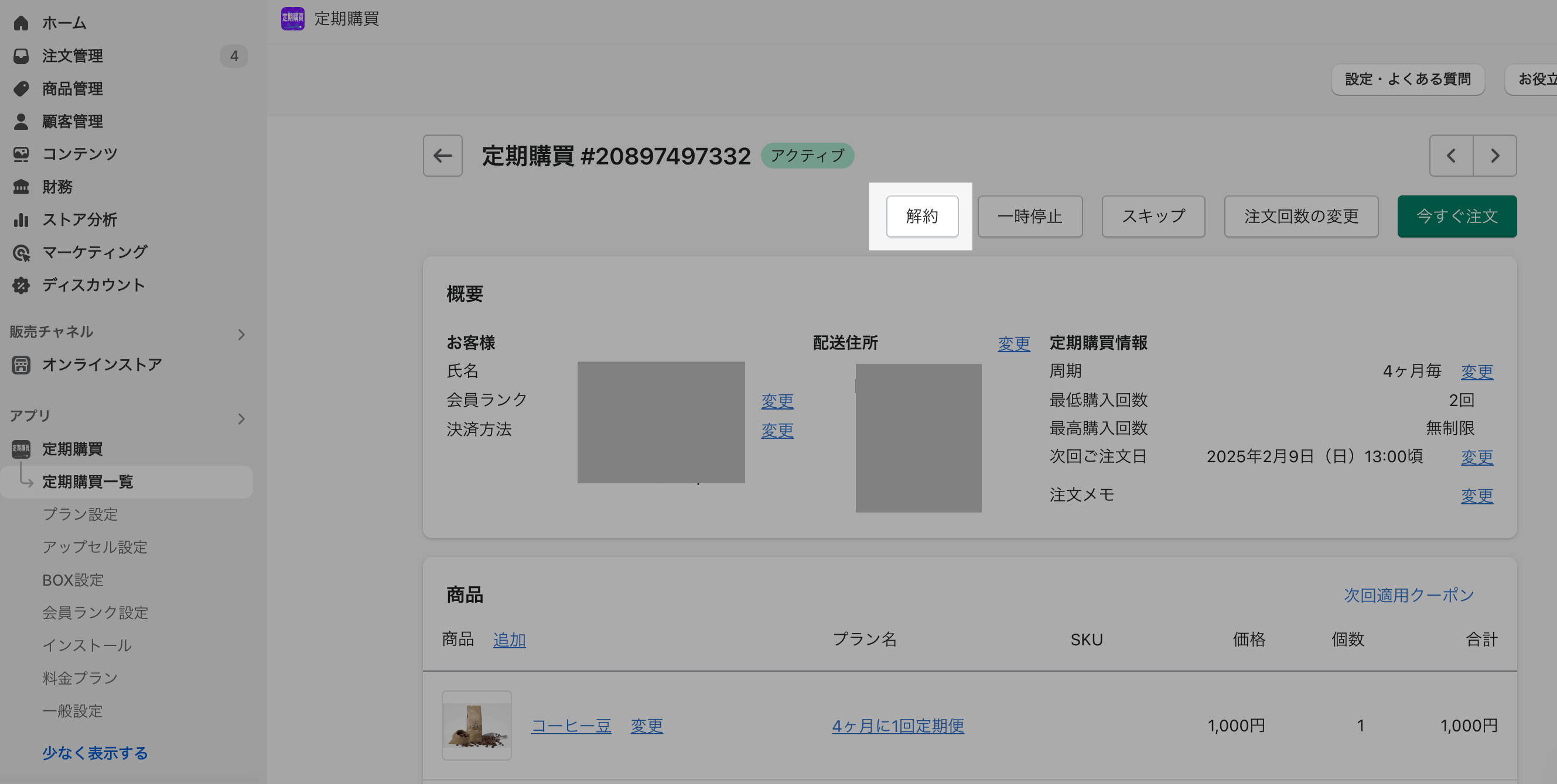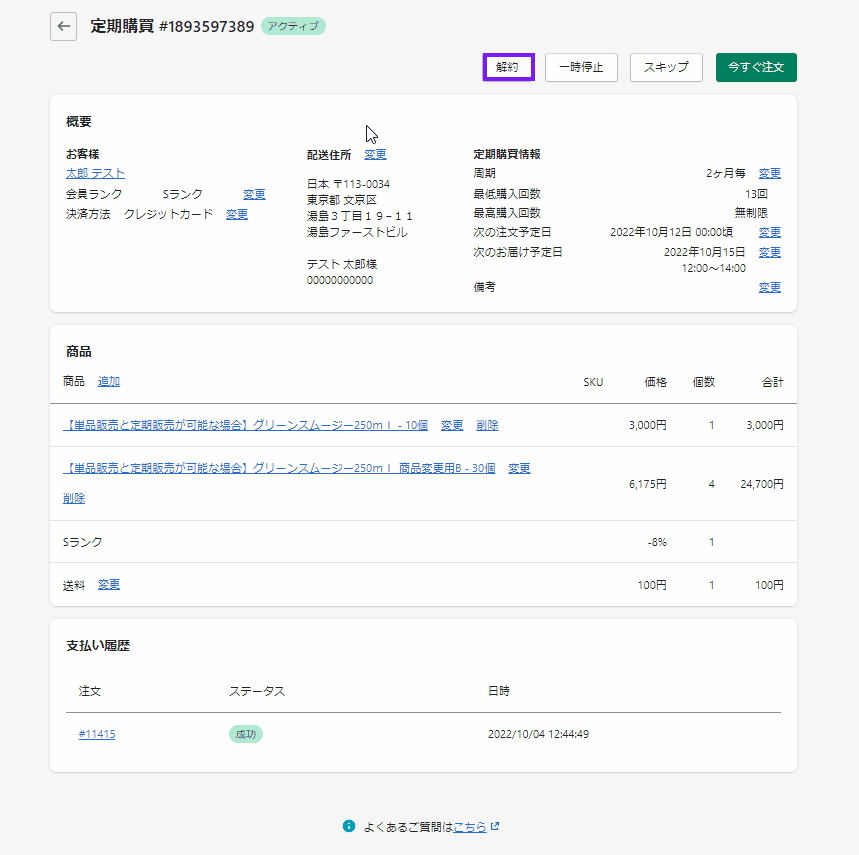 ストア管理画面と、顧客マイページから特定の定期契約を解約/再開出来る機能です。ストア管理画面や、顧客マイページに表示される「解約」をクリックして手続きを行います。