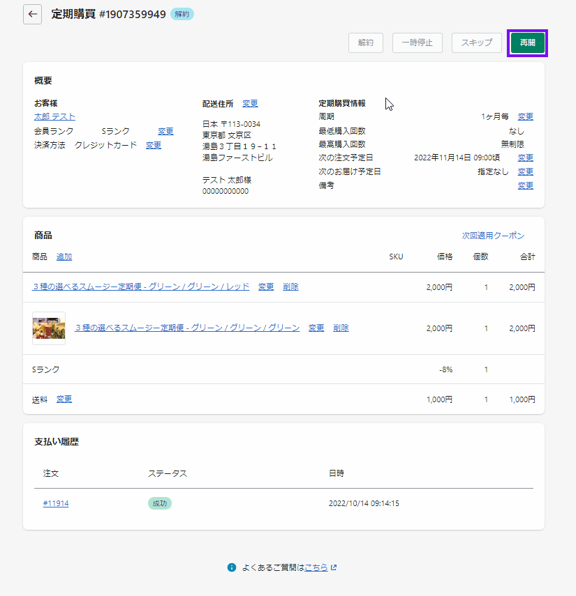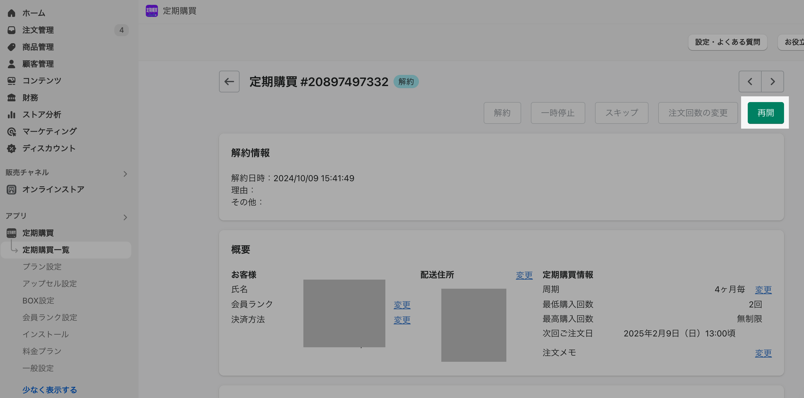 解約後はストア管理画面にのみ契約の「再開」ボタンが表示されます。このボタンをクリックすると定期契約が再開し、「次の注文予定日」から注文が作成されるようになります。