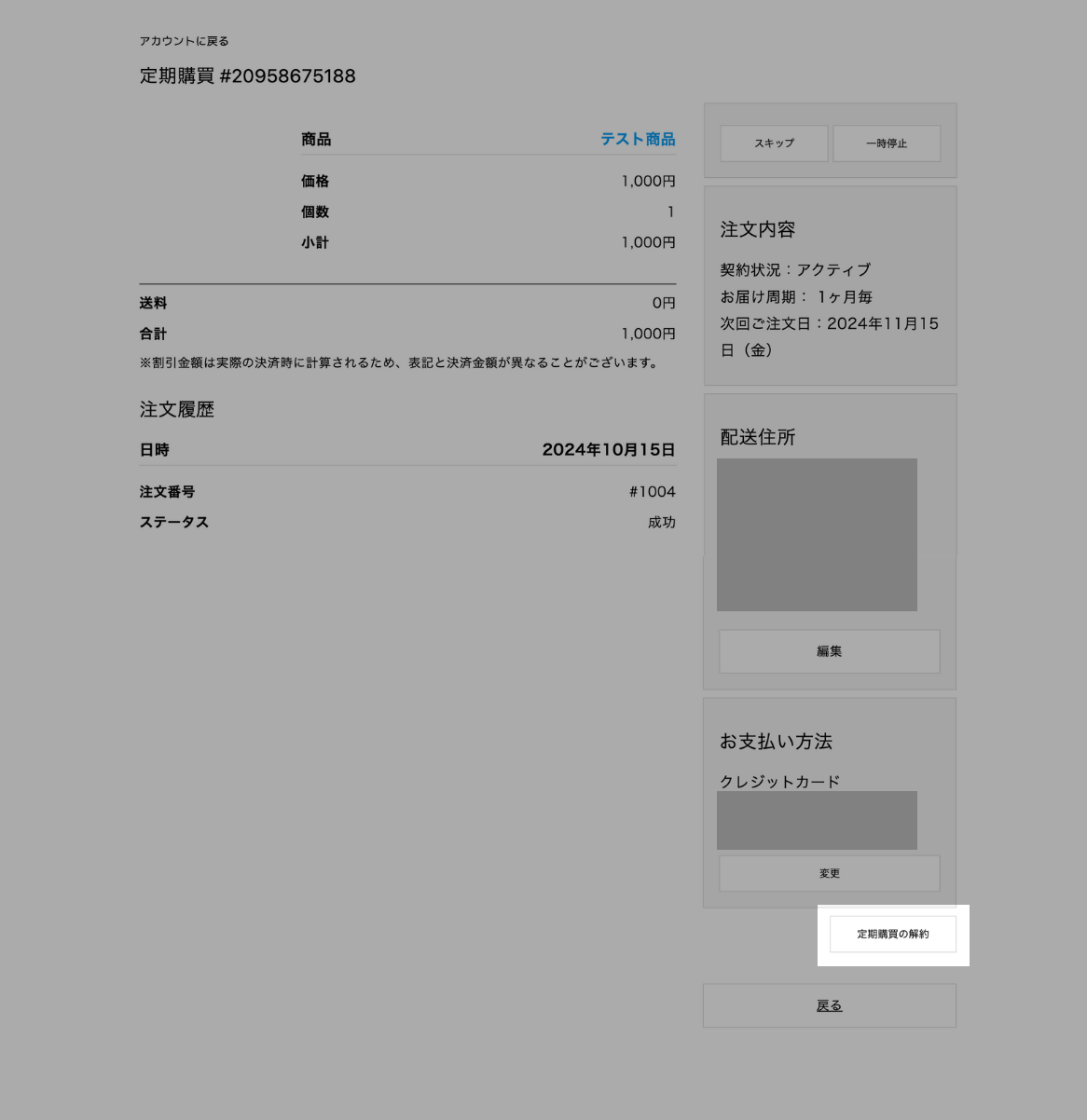 解約中は「再決済」、「今すぐ注文」、「追加購入」機能はご利用頂けません。