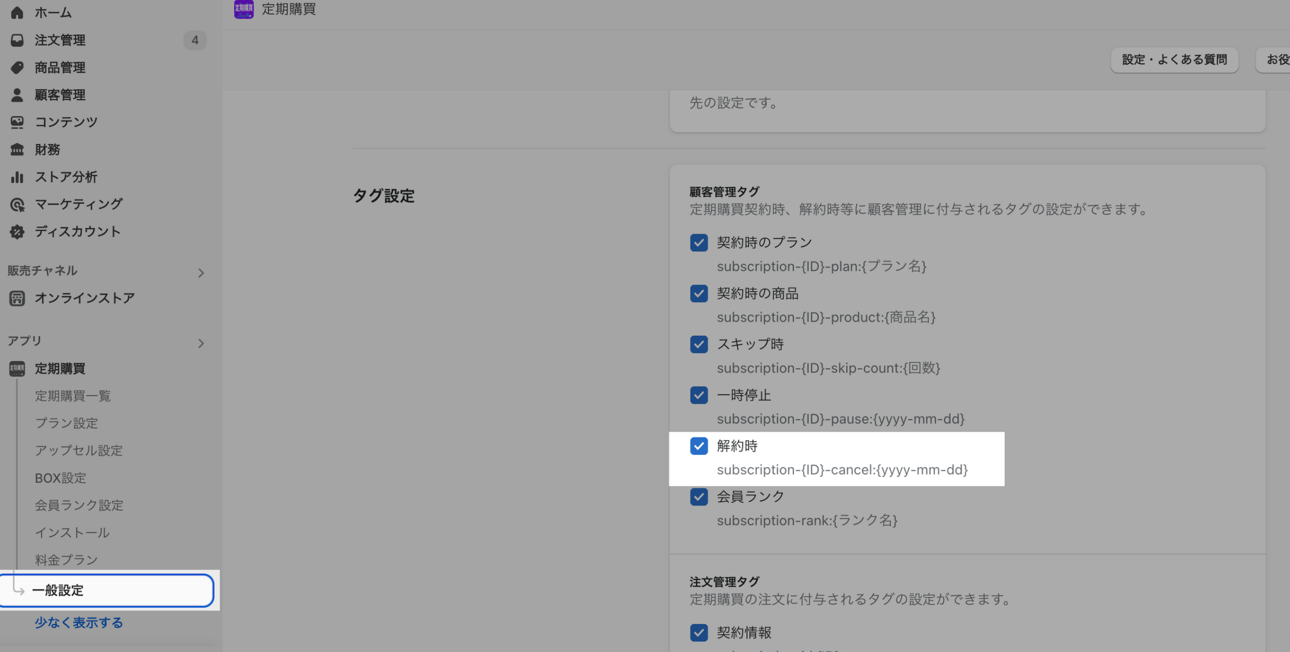 定期購買アプリ>一般設定にて顧客管理タグの「解約時」にチェック入れて保存してください。