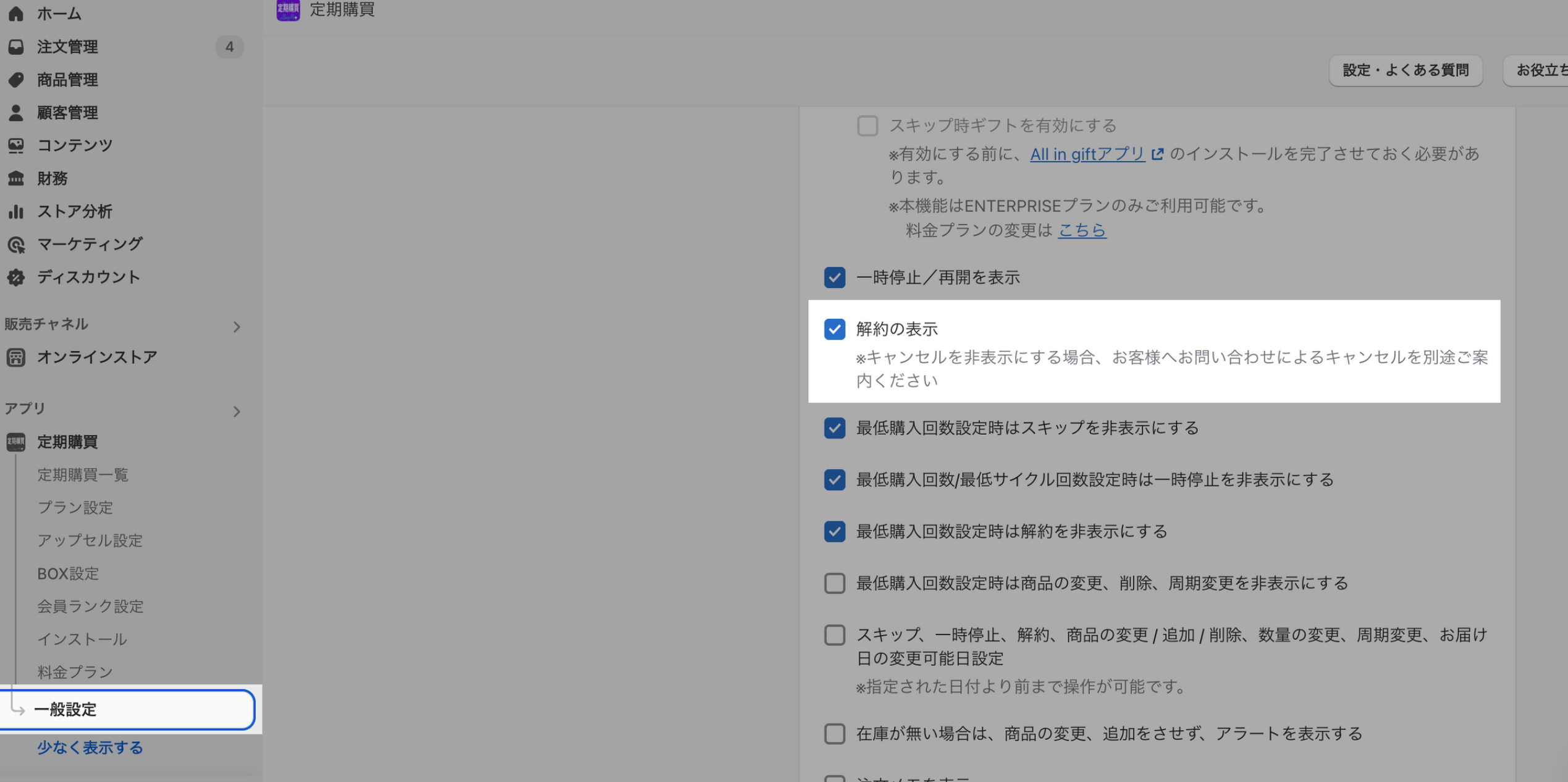 定期購買アプリ管理画面にて、 一般設定>マイページ設定の「解約の表示」にチェックを入れて「保存」ボタンを押下してください。