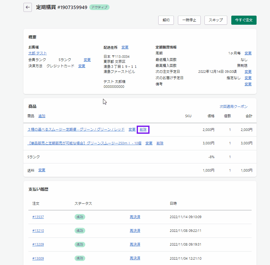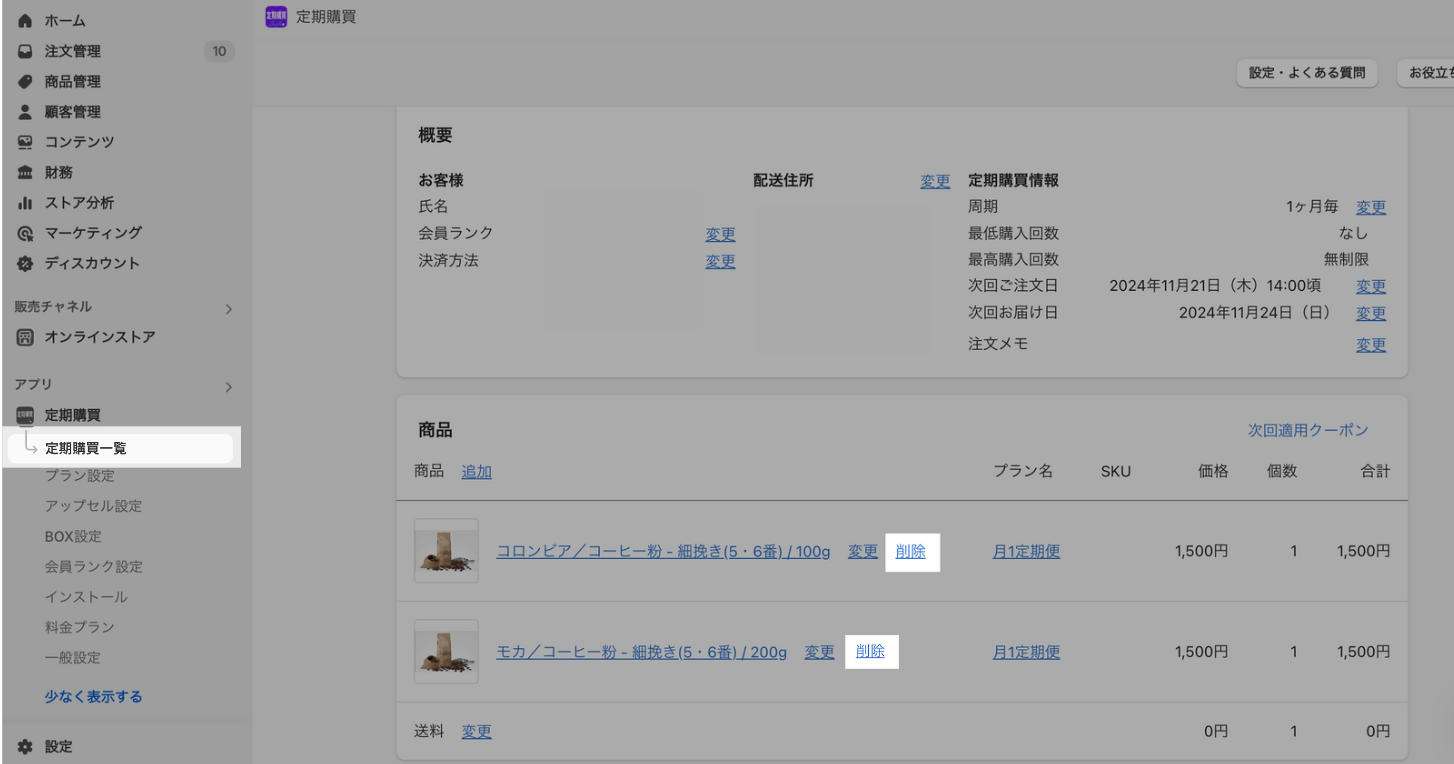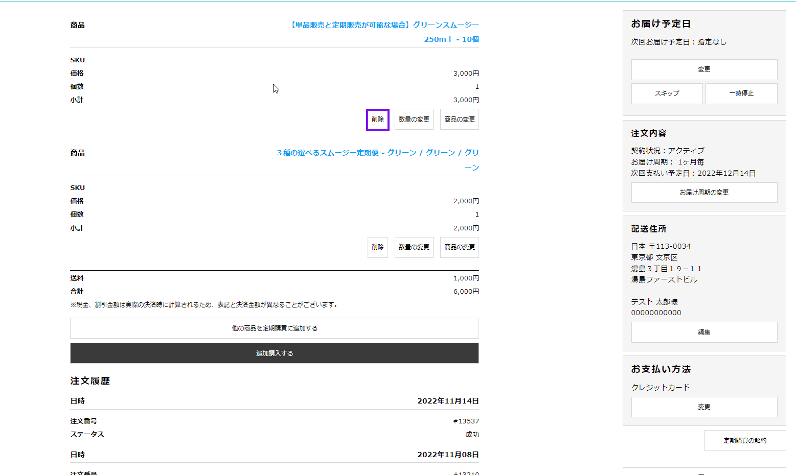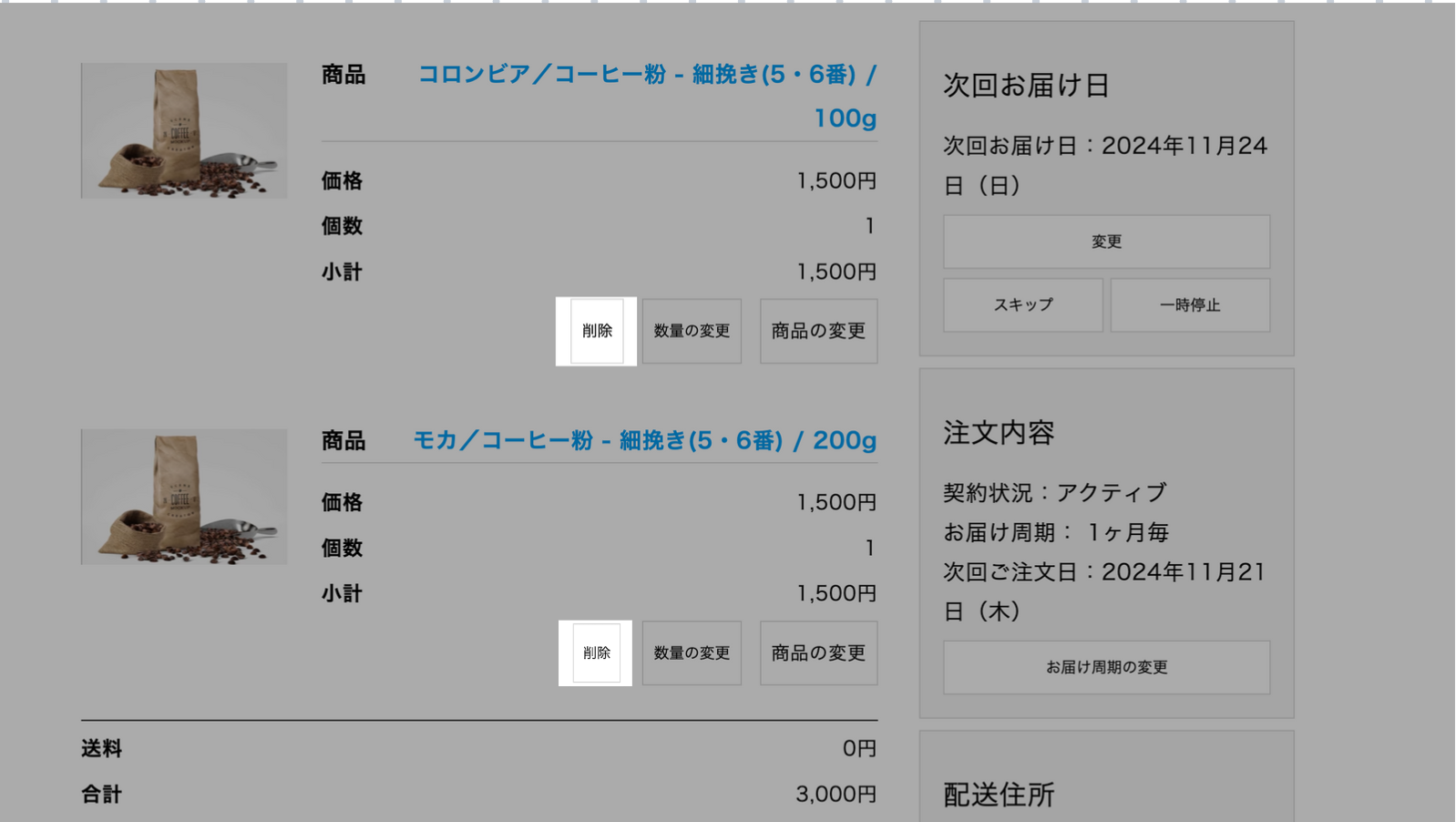 定期契約中商品の削除を行った場合、以降は削除した商品を除外した注文が作成されます。