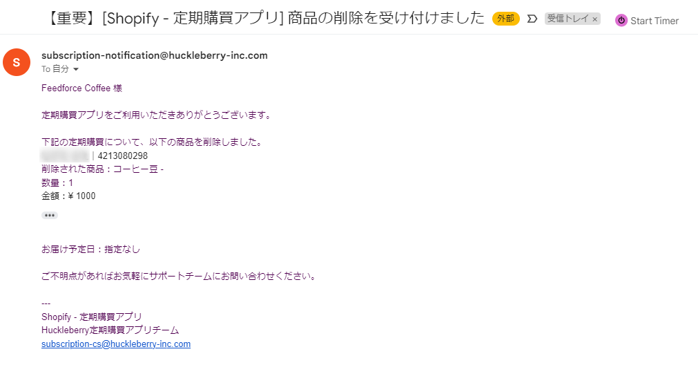 ユーザーマイページまたは、ストアの管理画面から、定期契約上の商品を削除した場合、ストア宛、顧客宛にそれぞれ以下のような通知が送付されます。