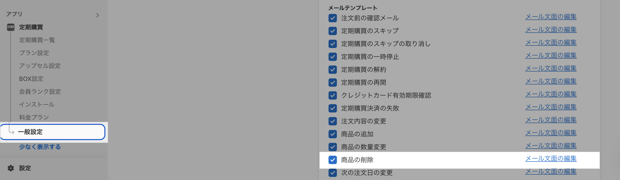 ※顧客宛に通知を送付したくない場合は、「一般設定」>「メール設定」>「メールテンプレート」にて「商品の削除」をOFFにしてください。