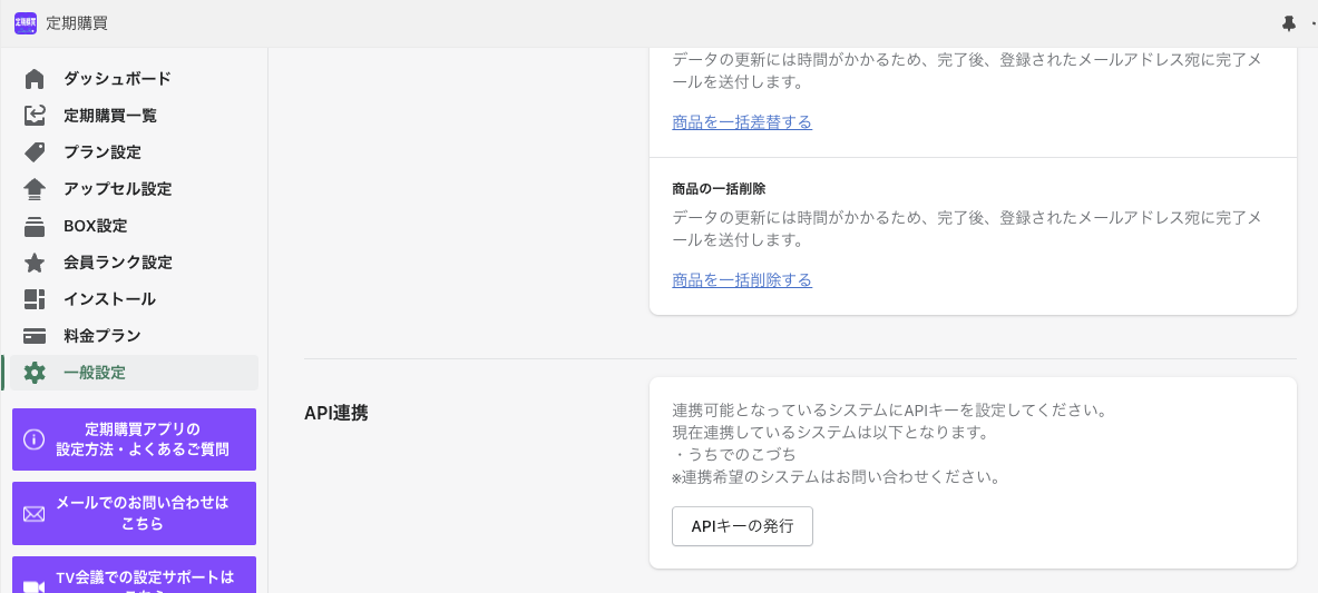 「一般設定>API連携」から「APIキーの発行」をクリックし、発行する。