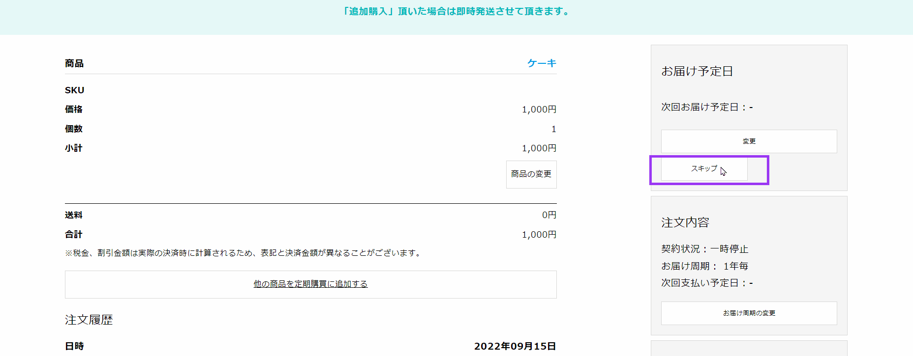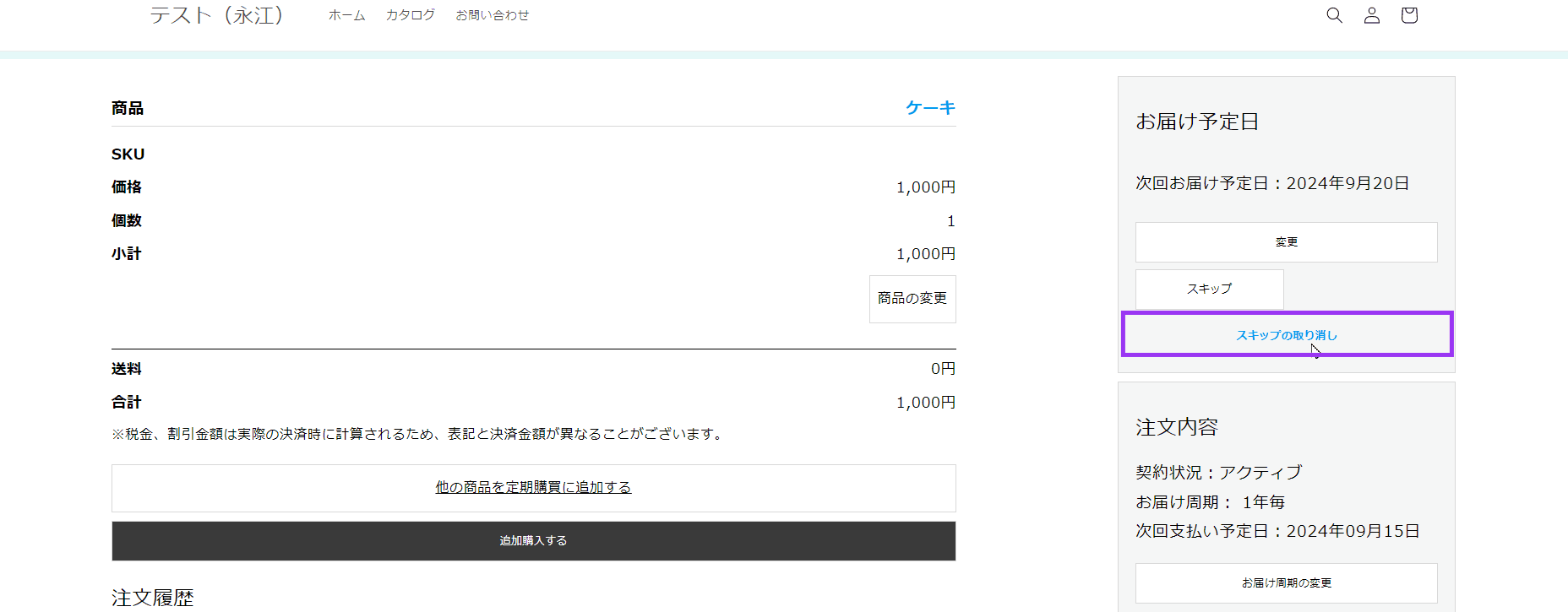スキップの取り消しを行った場合、スキップする前の「次回の注文予定日」が定期契約に反映されます。