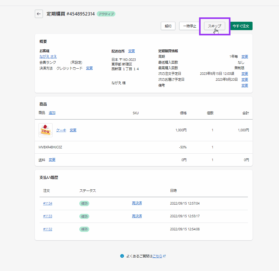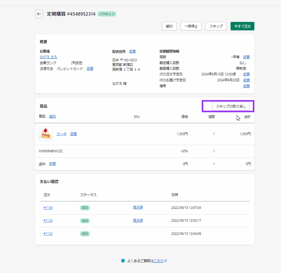 スキップ前に適用されていた「次回の注文予定日」を過ぎるまでは、「スキップの取り消し」ボタンがストアの管理画面と、顧客マイページのどちらにも表示されます。
