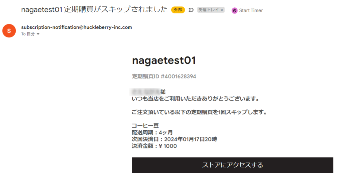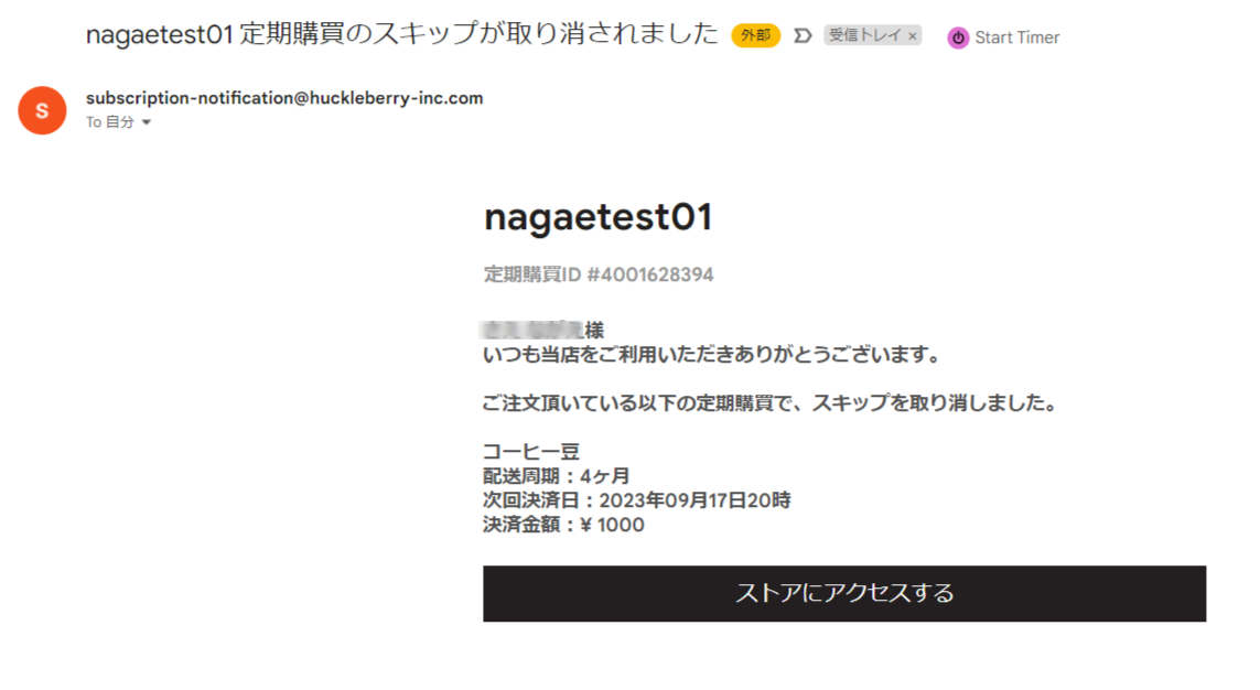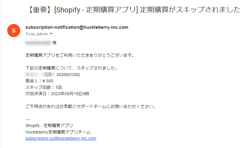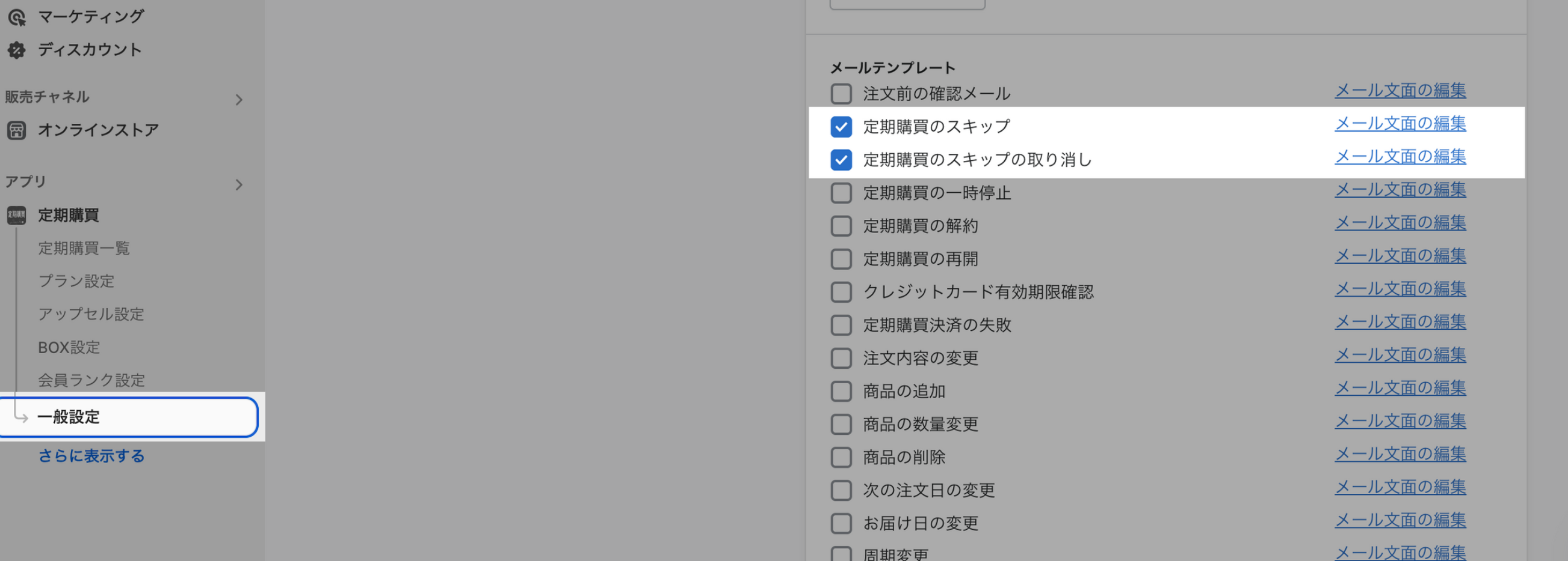 ※顧客宛の通知のみOFFにする事が可能です。通知をOFFにしたい場合は、一般設定のメールテンプレートにて「定期購買のスキップ」「定期購買のスキップの取り消し」からチェックを外してください。