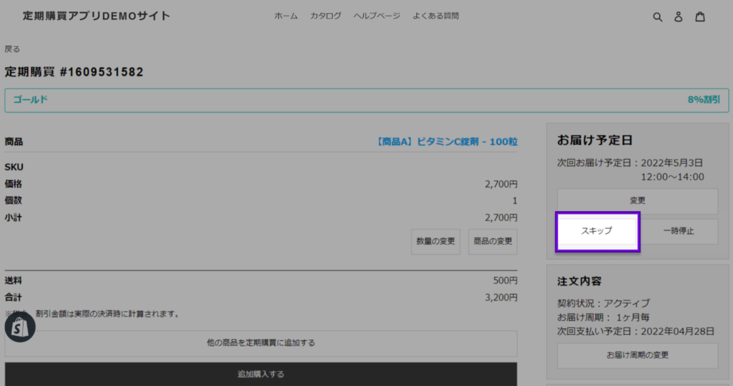 特に設定の必要ありません。デフォルトで定期契約上に「スキップ」を行うボタンが表示されています。