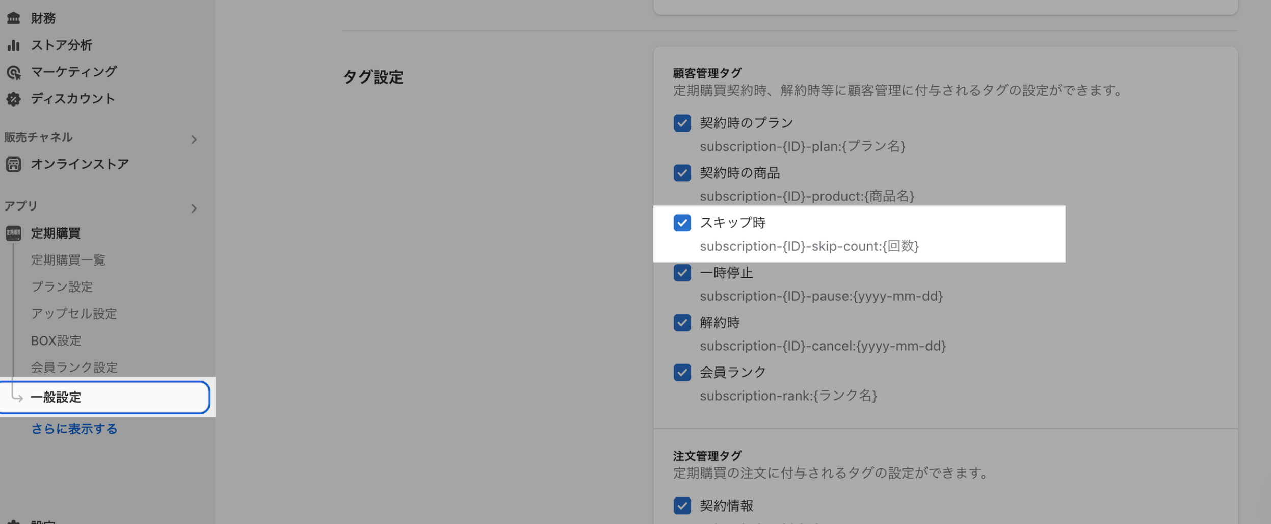 定期購買アプリの一般設定で「スキップの表示」をONにしてください。この設定によって顧客マイページ上に「スキップ」を行うボタンが表示されるようになります。