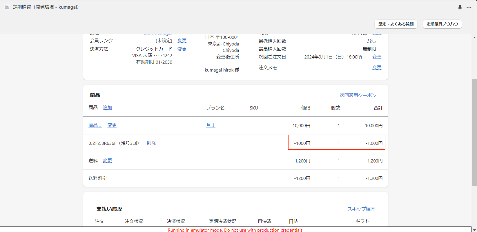 2000円の注文に対し10,000円のクーポンを付与した場合、10,000円と表示