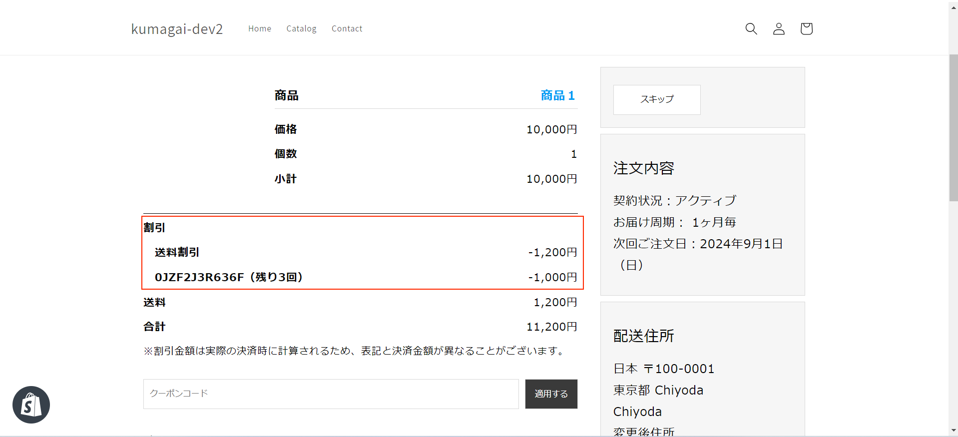 システム都合上、割引金額をShopifyから取得する処理を非同期化する必要があり、最新の割引金額が表示されないケースがございます(基本的には画面リロードを行うことで最新の割引金額が表示されます)。