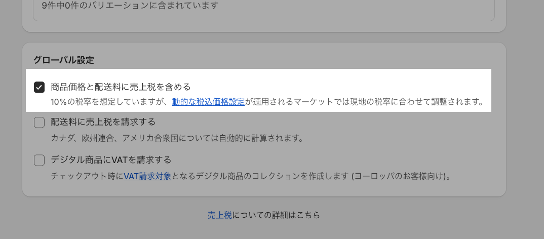 設定>関税と税金を開くグローバル設定>商品価格と配送料に売上税を含めるをオンにする